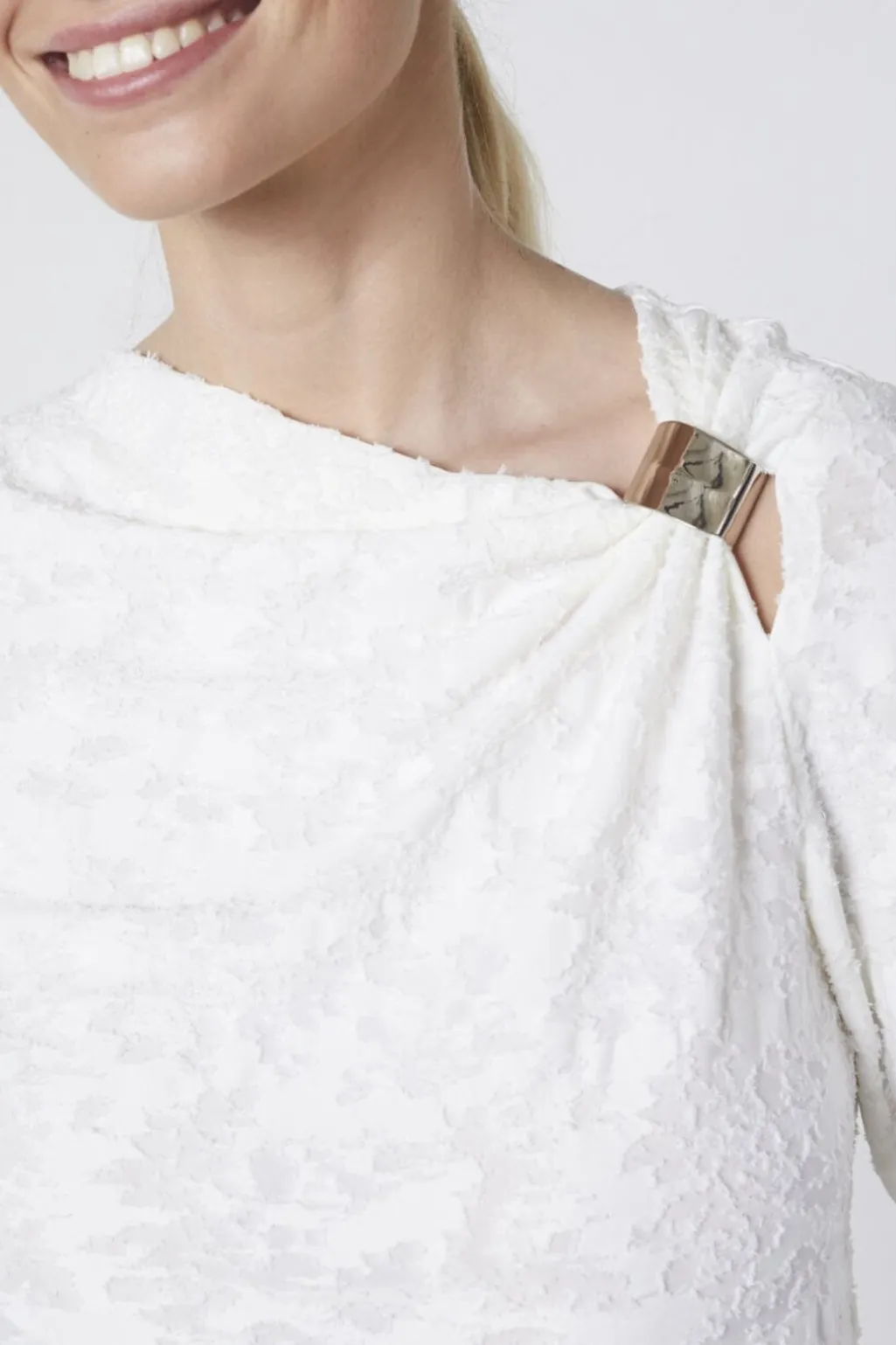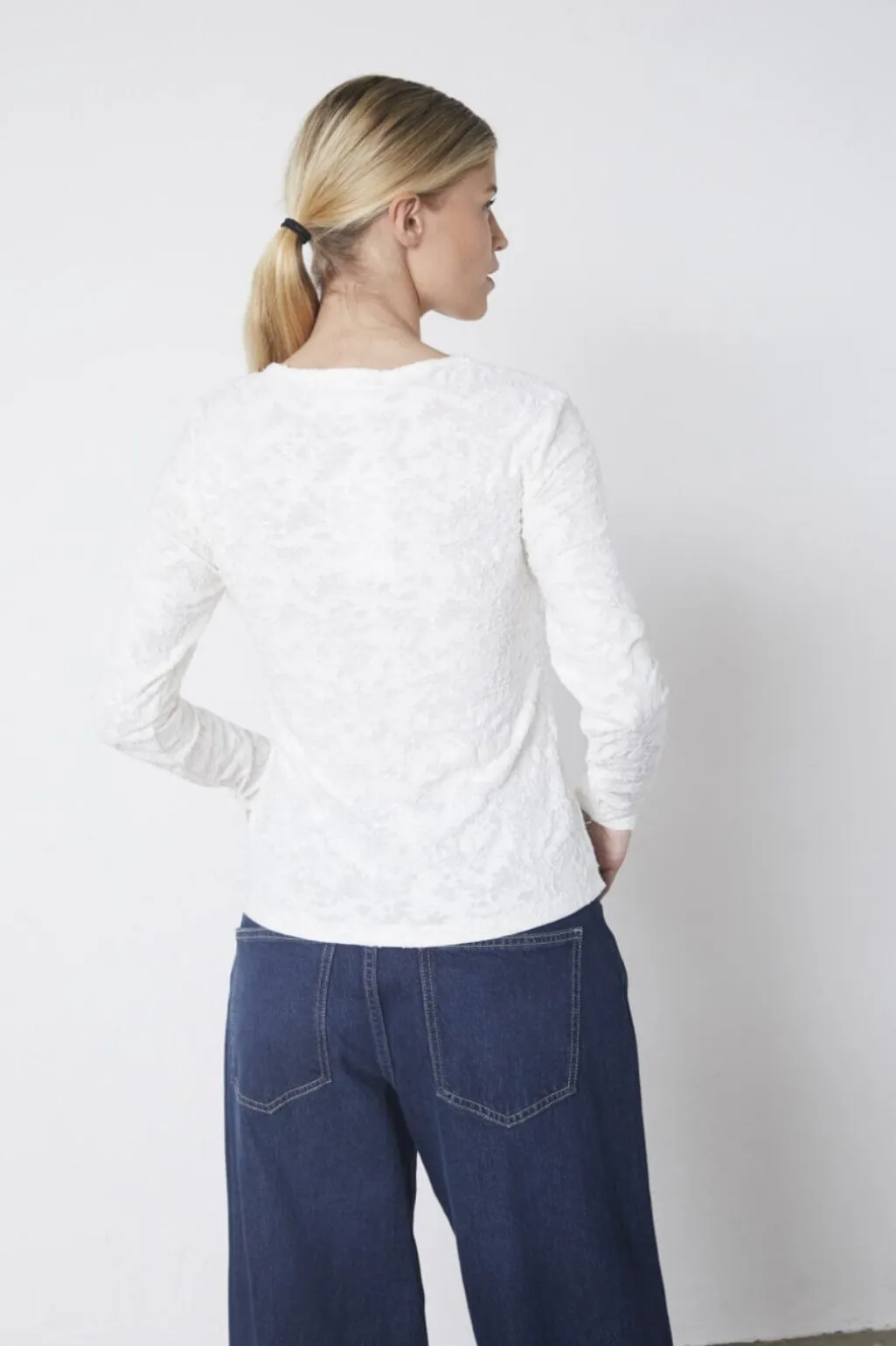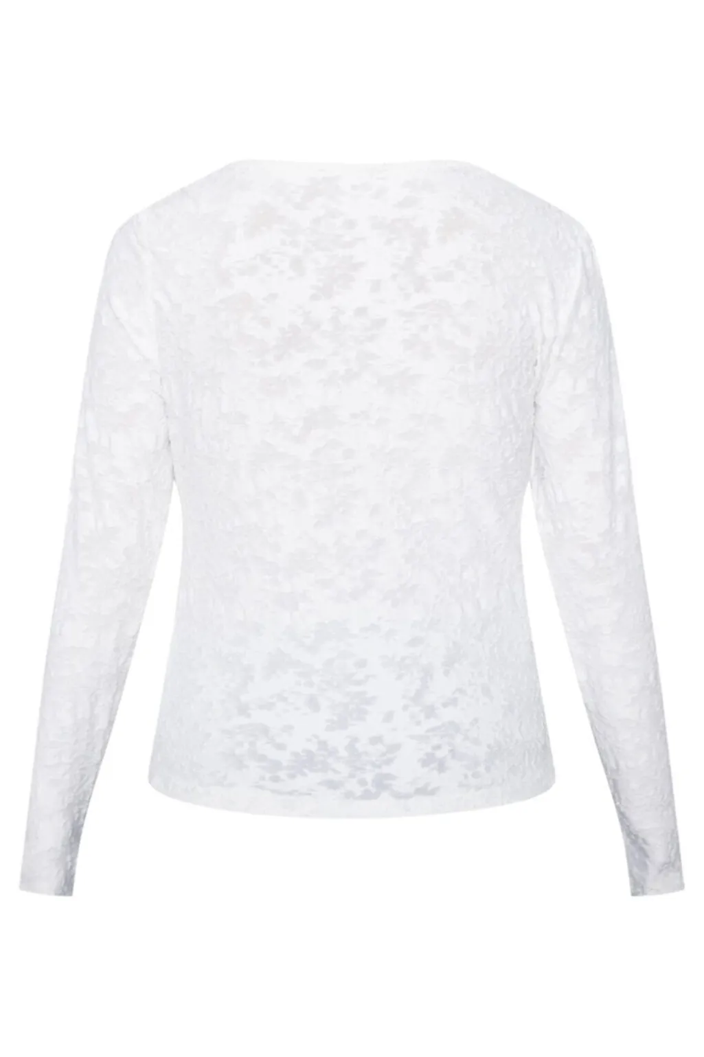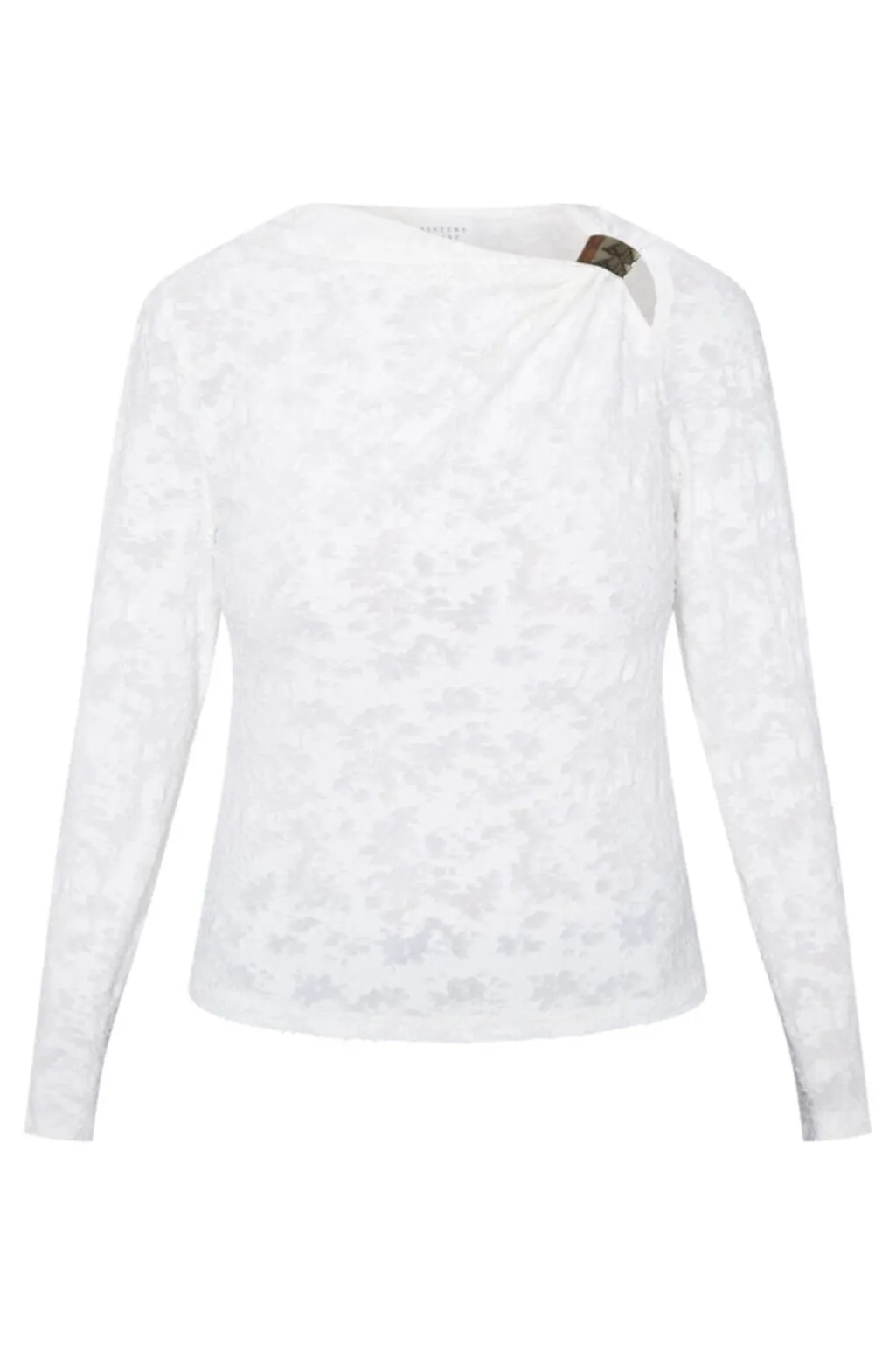 Cremehvid bluse fra Sisters Point med et floralt burnout-mønster. Blusen har lange ærmer og en slim fit-pasform. Et dekorativt metalspænde pryder den runde hals.