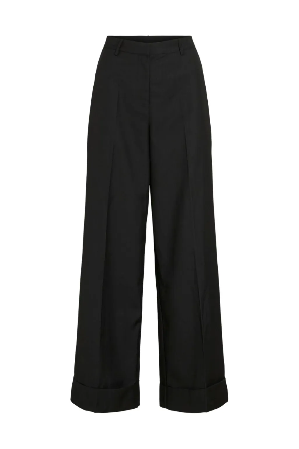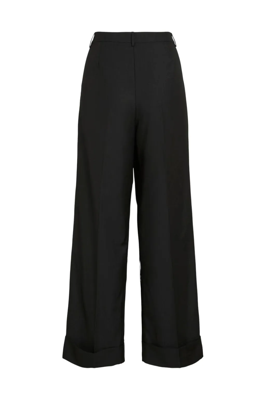 Sorte bukser fra Vila med høj talje og løs pasform. Bukserne har brede ben med oprullede manchetter og bæltestropper i taljen. De er udstyret med sidelommer samt praktisk lynlås- og knaplukning.