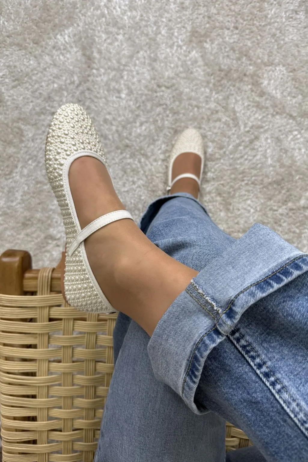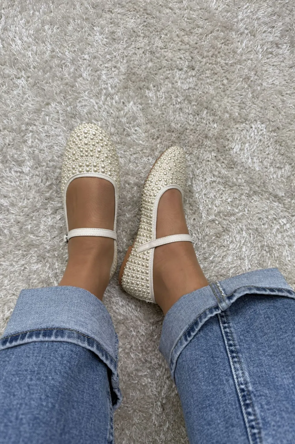 Sandal fra Steve Madden i elfenbensfarvet stof med perledetaljer på overdelen. Den runde tå og remmen med spænde giver en god pasform.