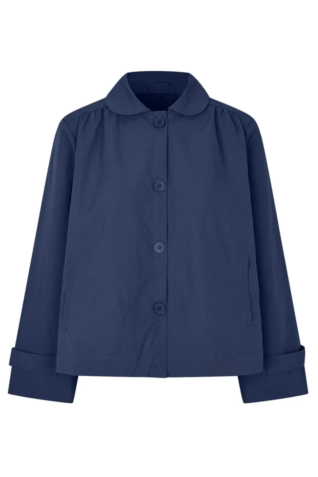 Mørkeblå jakke fra Lollys Laundry med rund krave og afslappet pasform. Jakken har frontknaplukning og lange ærmer med justerbare manchetter.