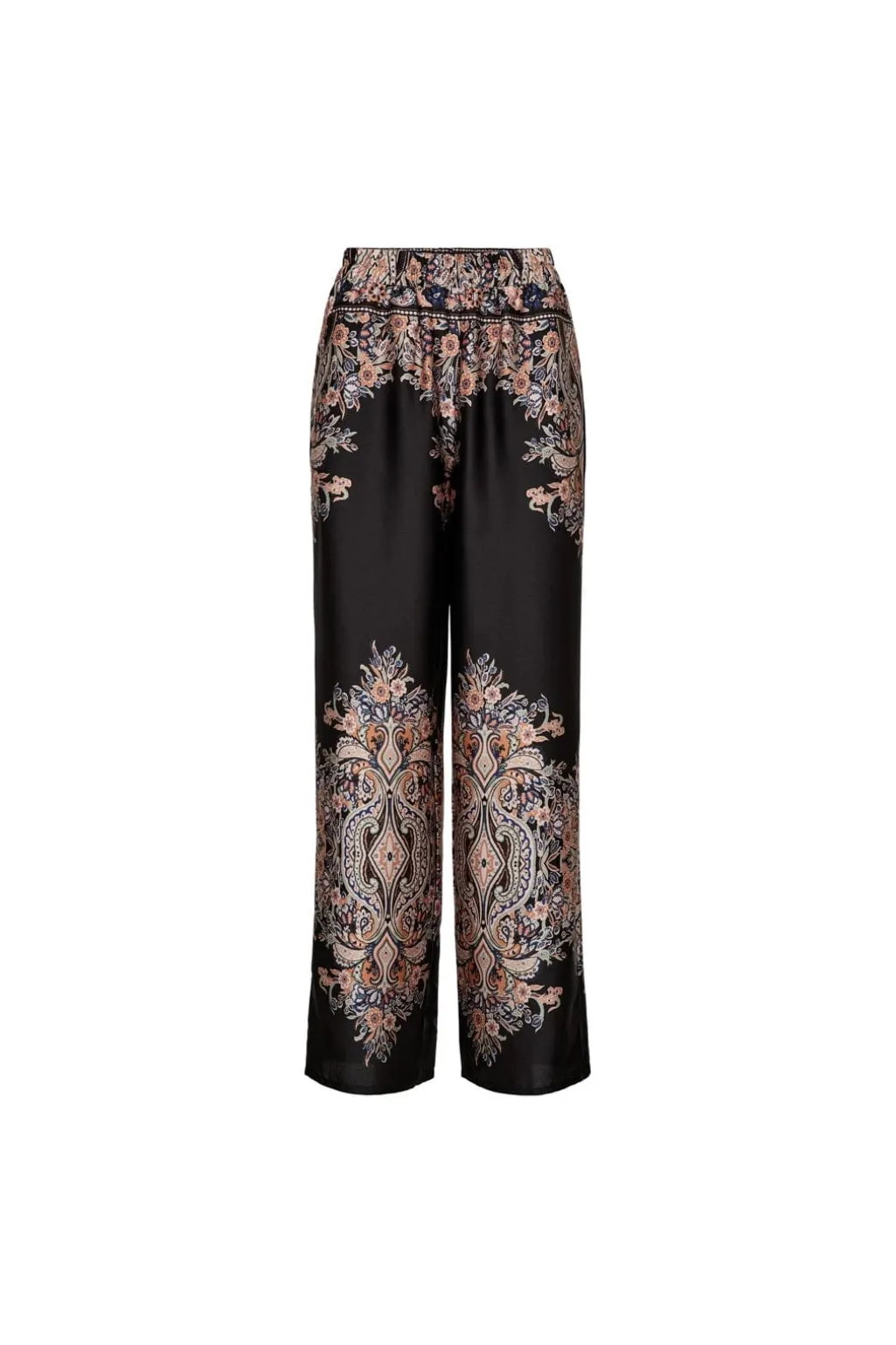 Sorte bukser fra Liberte med paisleymønster i beige og brune nuancer. Bukserne har flæser og dekorative syninger, der giver dem et detaljeret udtryk.