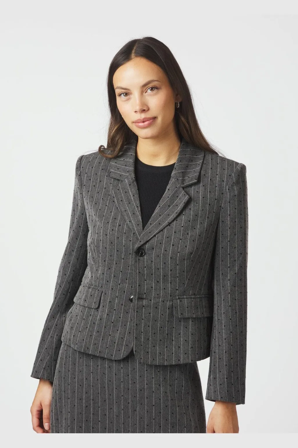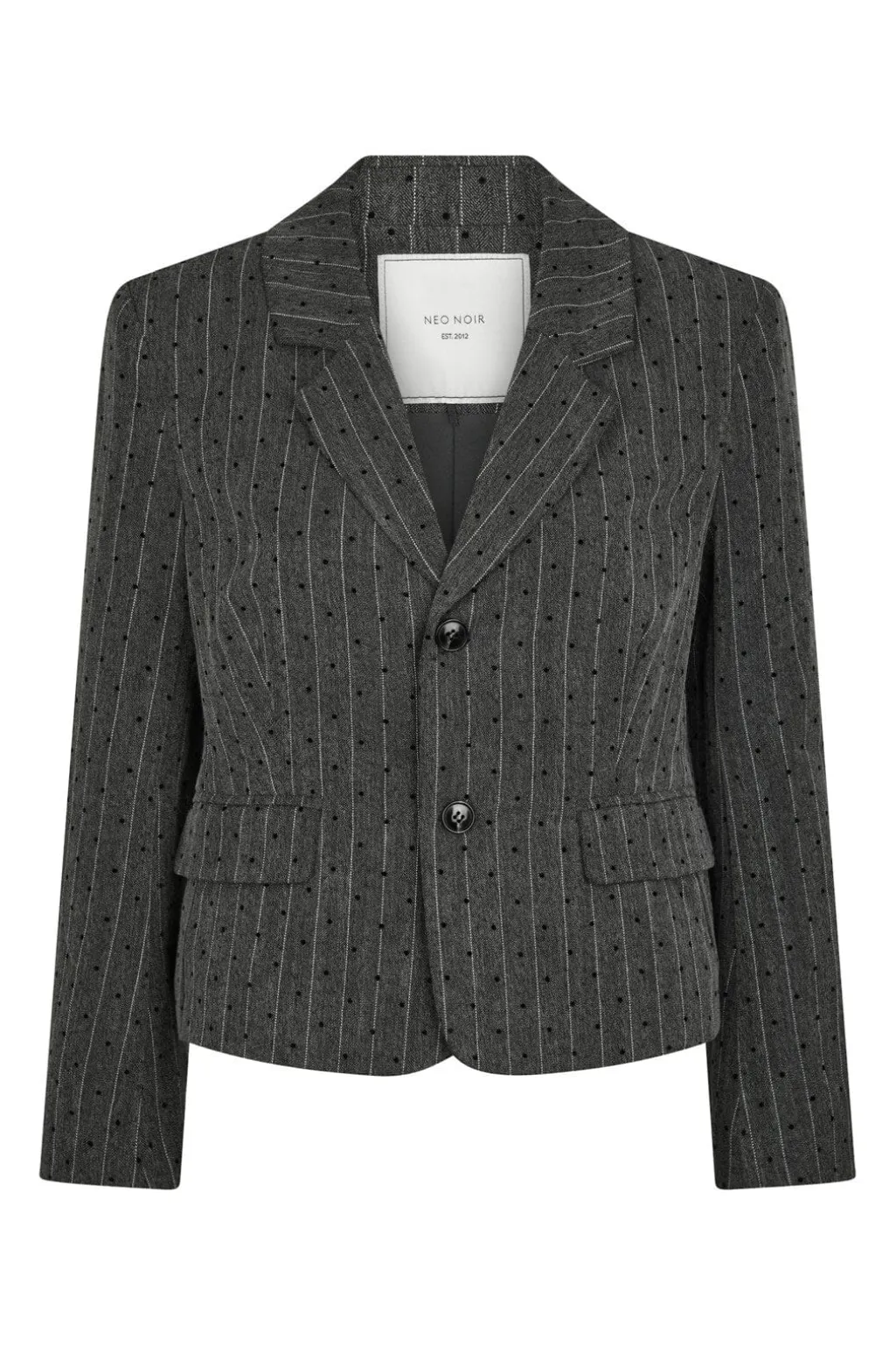 Mørkegrå blazer fra Neo Noir med en kombination af pinstripe, polka dot og herringbone-mønster. Blazeren har en kort, tætsiddende pasform med reverskrave og to-knapslukning.