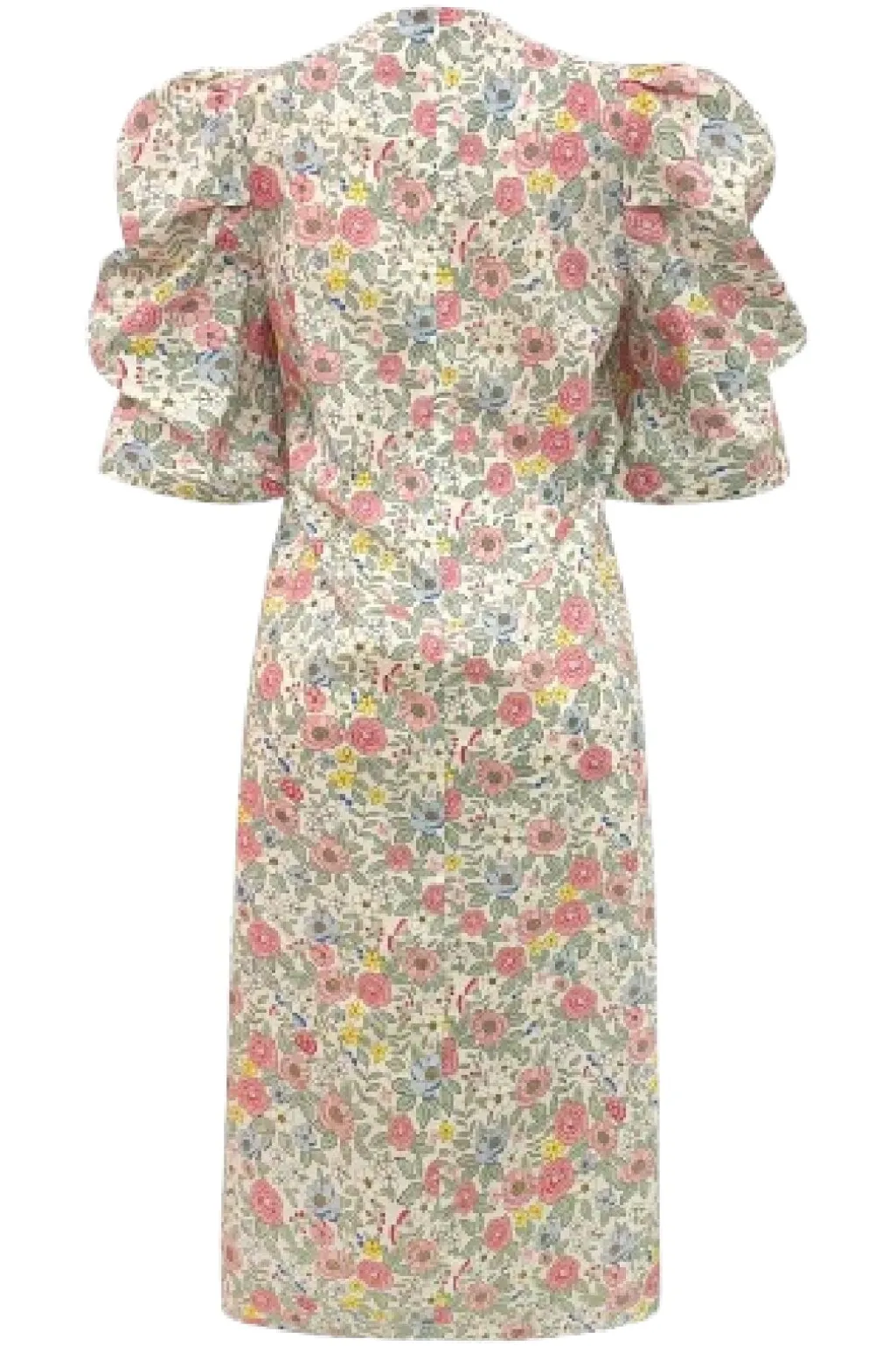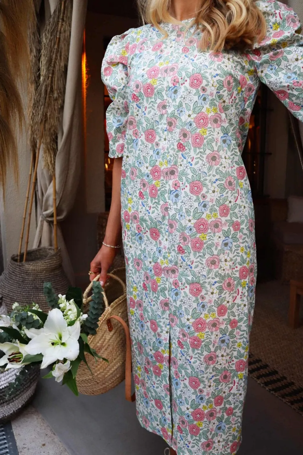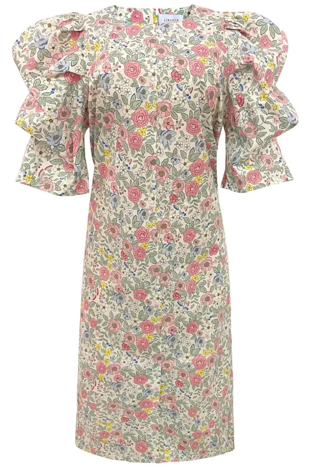 Kjole fra Liberte i elfenbensfarvet med blomsterprint i pastelfarver. Kjolen har pufærmer i 3/4 længde og flæsedetaljer på ærmerne og ved halsen.