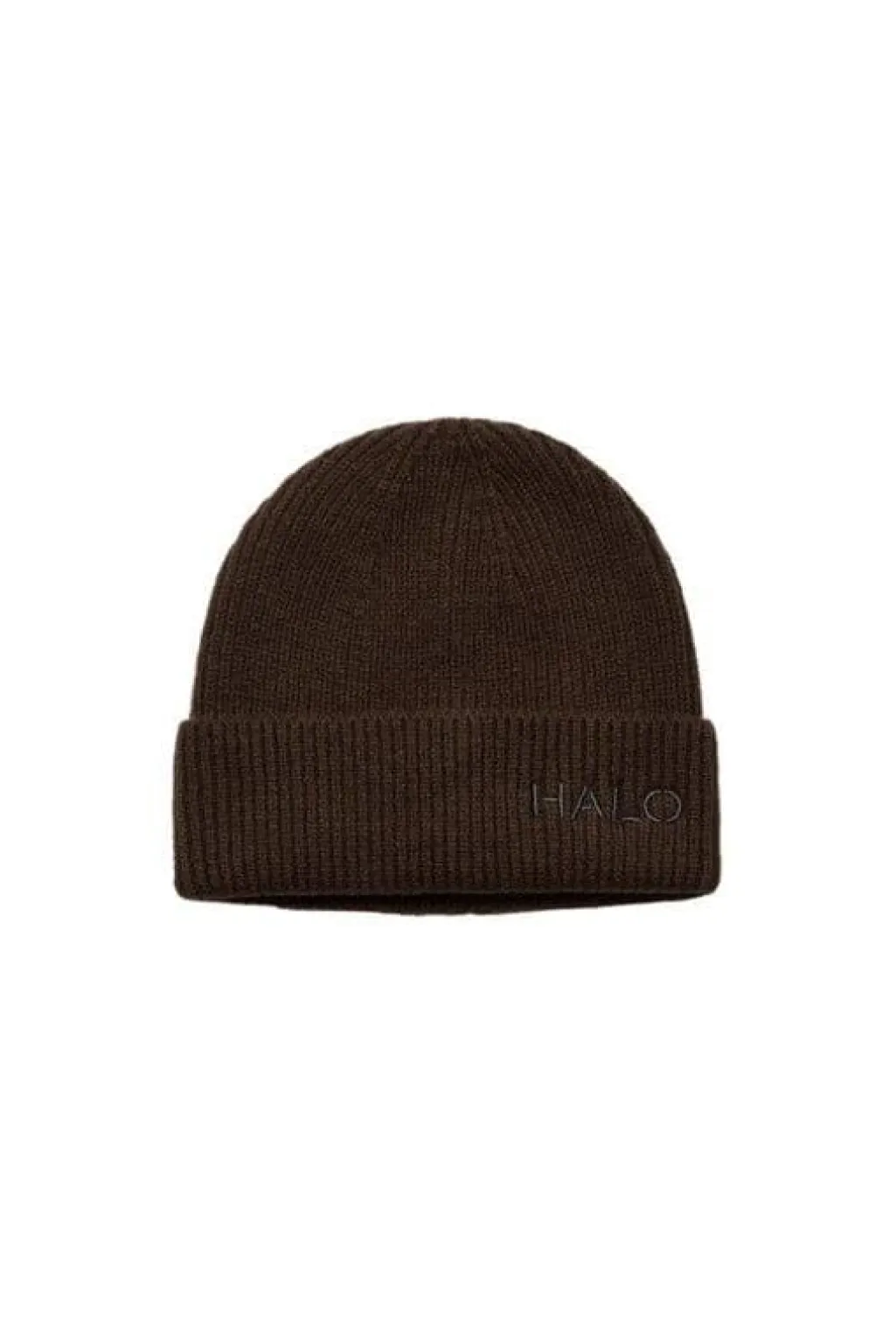 Ribstrikket hue fra Halo, lavet af 100 % uld i en brun farve. Huen har en foldet kant og et diskret HALO-logo broderet foran.