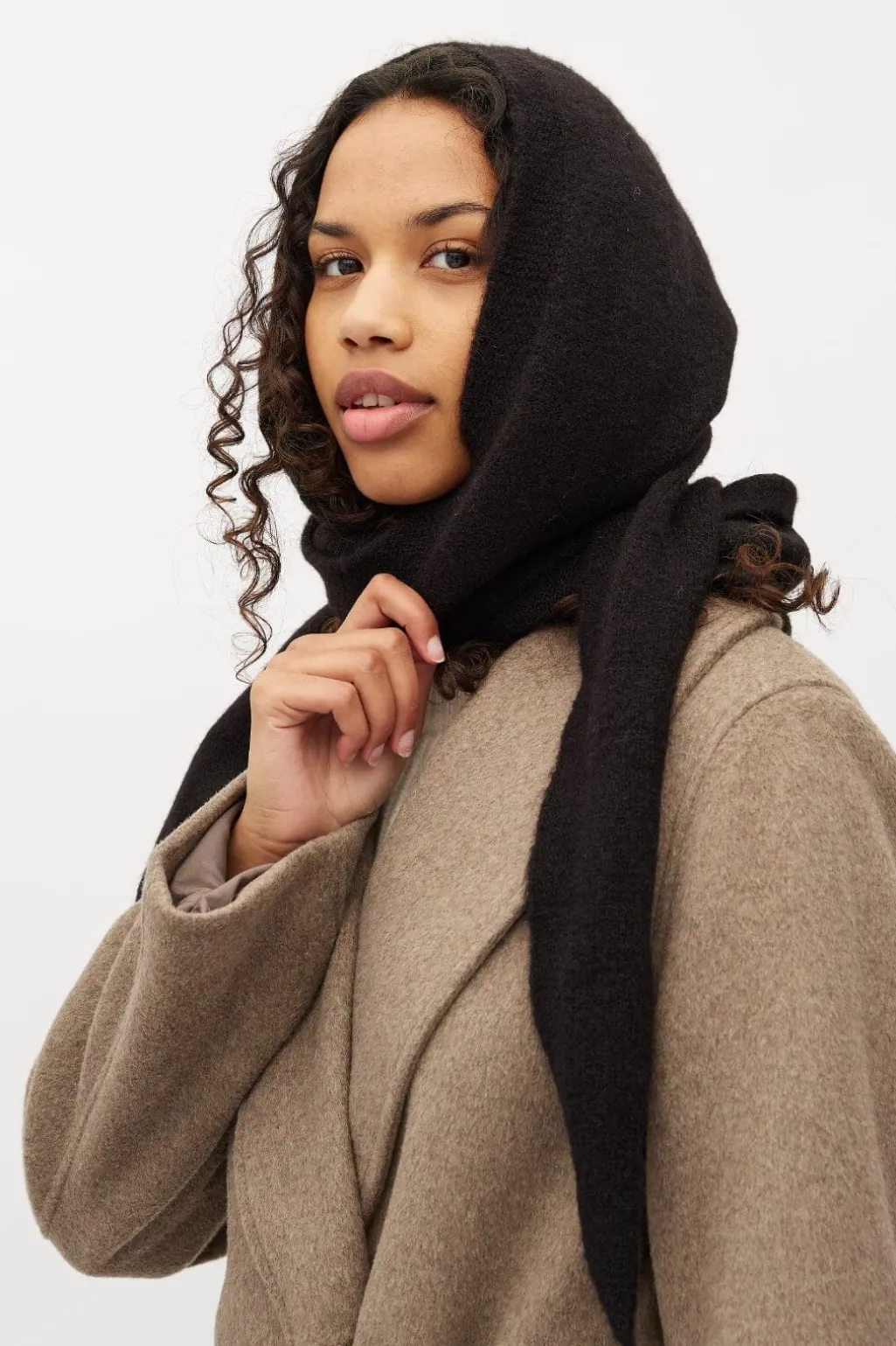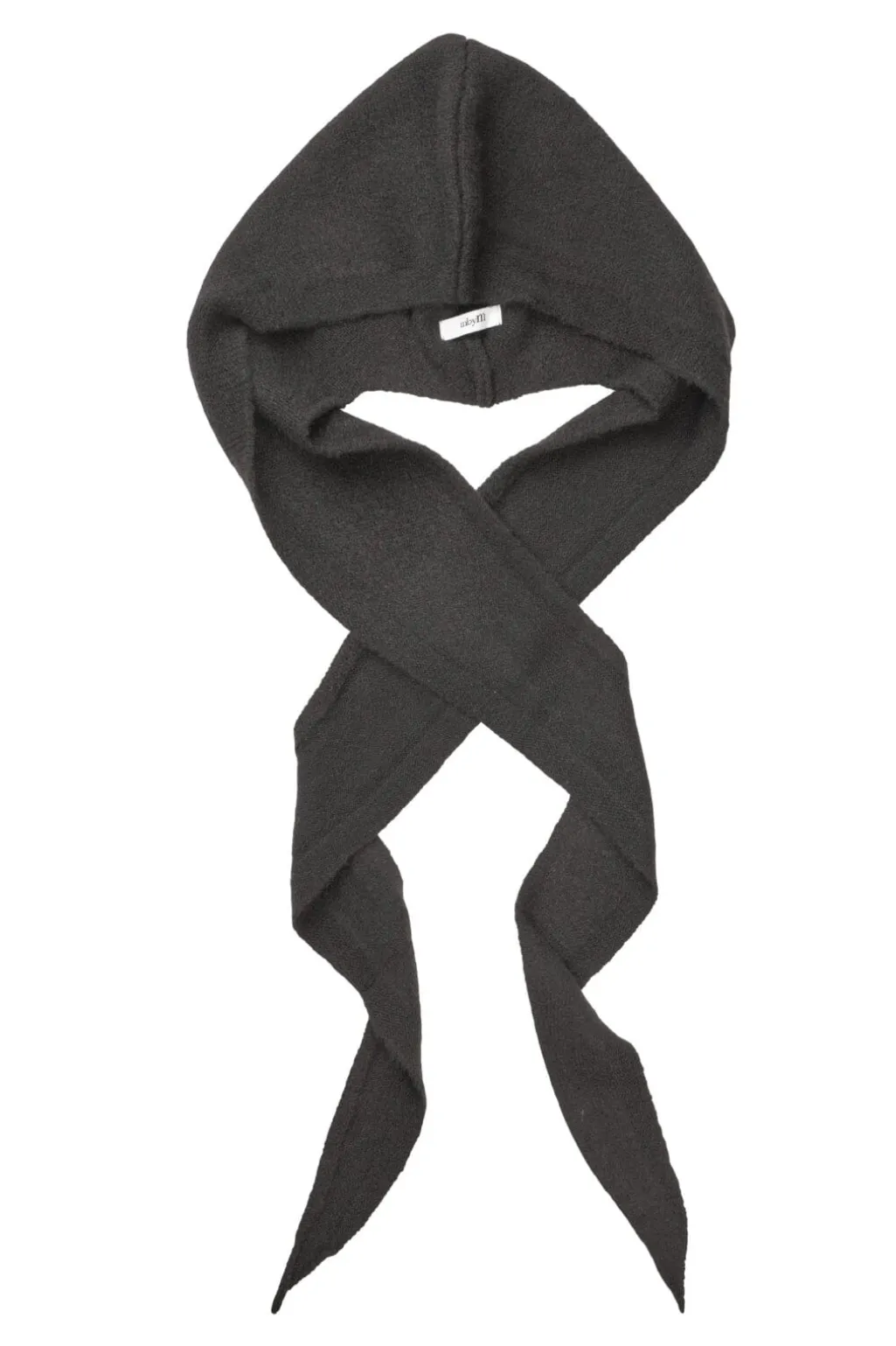 Sort tørklæde fra MbyM med hætte og lange ender til at binde rundt om halsen. Det ensfarvede design gør det nemt at matche.