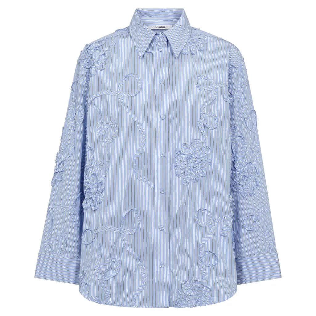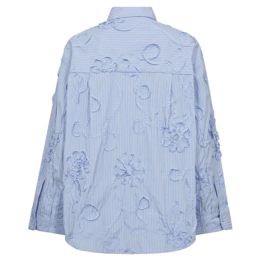 Stribet skjorte fra Co´Couture i lys blå med hvide striber. Skjorten har broderede blomsterdetaljer og rynker i stoffet.