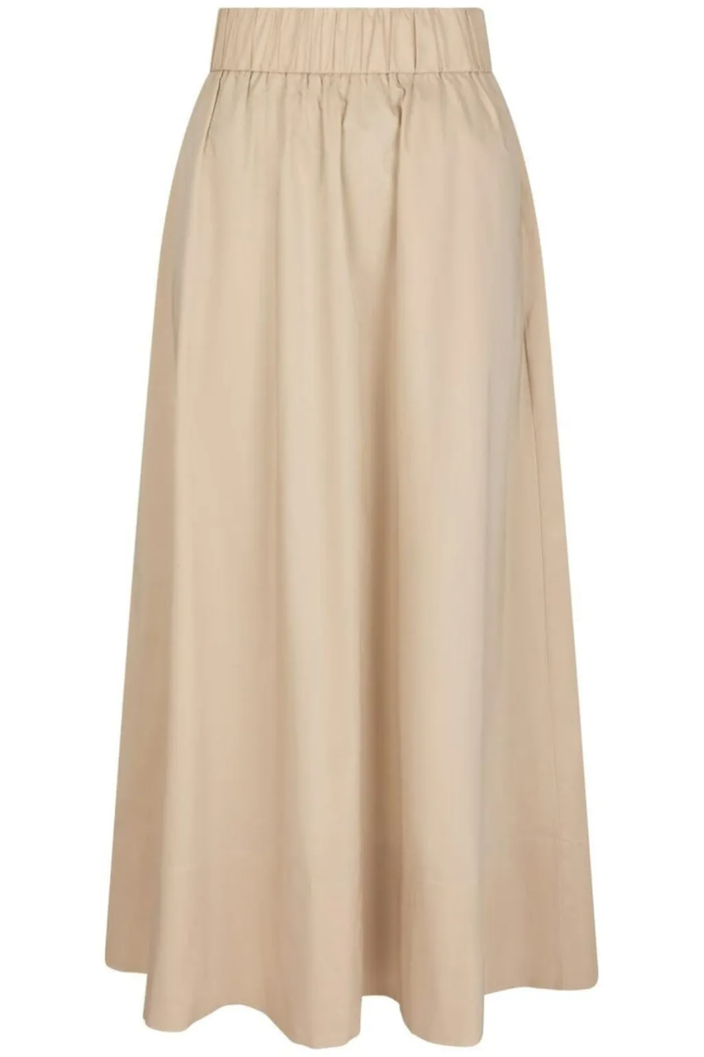Lang poplin-nederdel fra Neo Noir i beige. Den har høj talje med elastik og falder løst ned til midt på læggen. Sidelommer og ruching giver nederdelen et feminint præg.