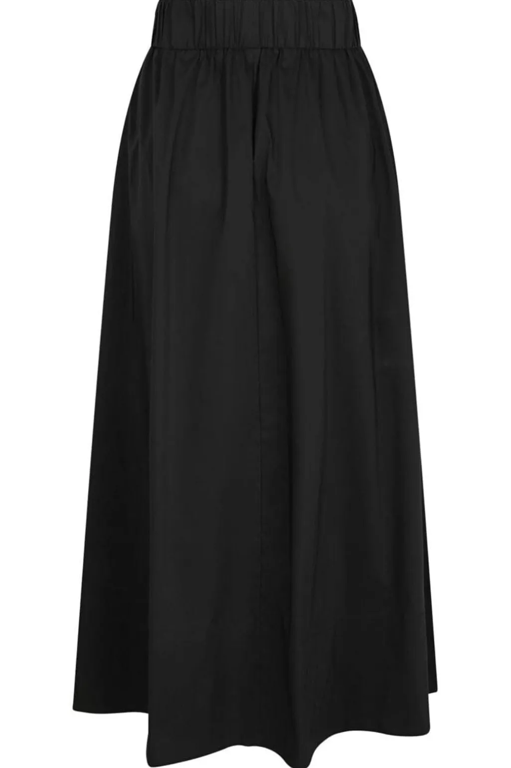 Sort poplin-nederdel med høj talje og elastik i taljen. Den er lavet i en blød bomuldsblanding og har en længde, der går til midt på læggen.