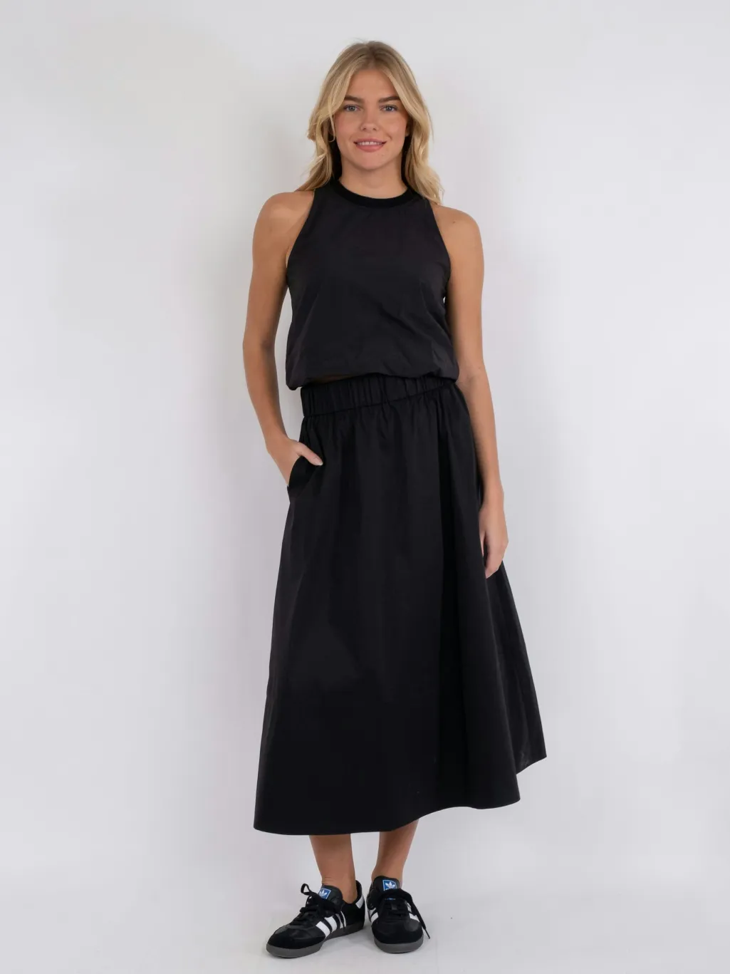 Sort poplin-nederdel fra Neo Noir med høj elastik i taljen. Nederdelen har praktiske lommer i siden og går til læggene. Den er lavet af let bomulds-poplin med stretch.