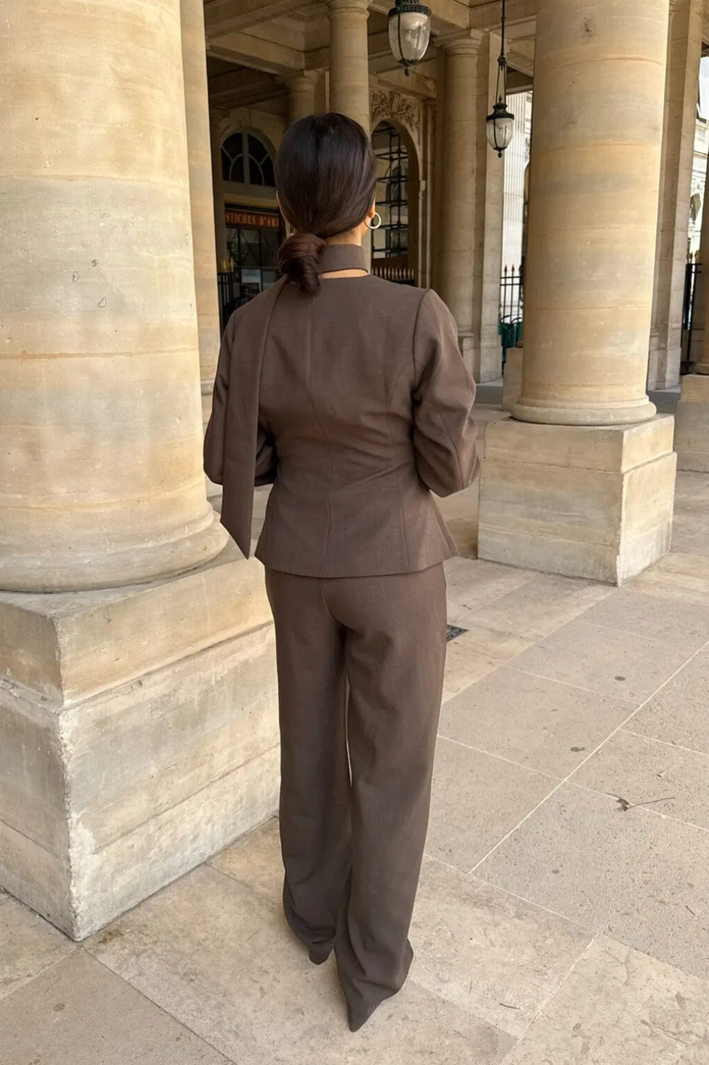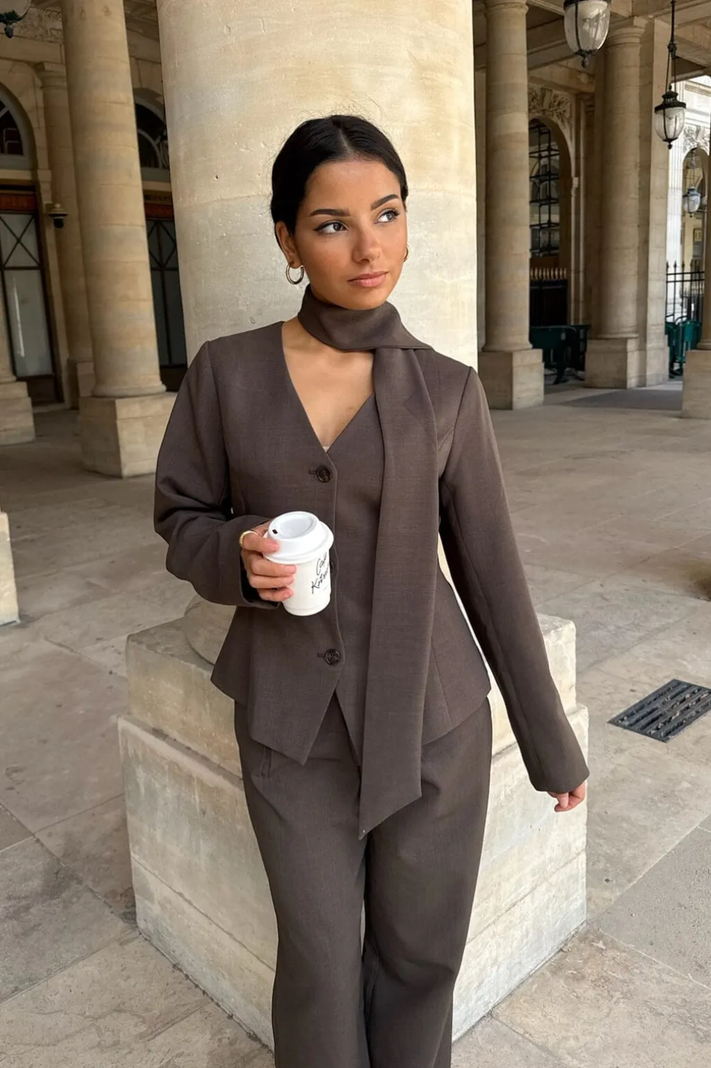 Mørkebrun blazer fra BYIC med V-udskæring og slim fit-pasform. Blazeren har et bindebælte, der kan bruges i taljen eller som halstørklæde, og lukkes med mørkebrune knapper foran.