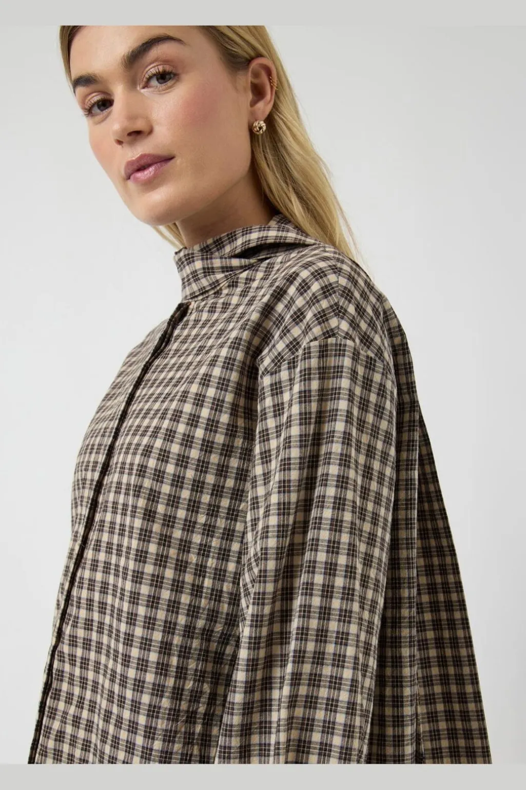 Lang skjorte fra YAS, lavet af 100 % bomuld med et ternet mønster i brune og beige nuancer.