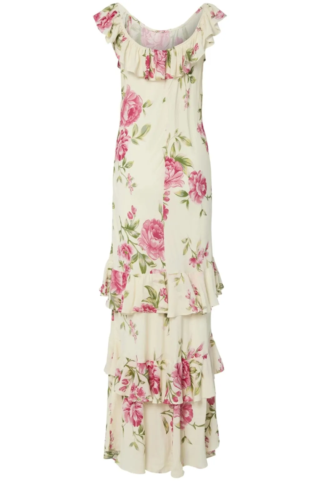 Lang kjole fra Y. A.S med cremefarvede og pink blomster. Kjolen har en off-shoulder udskæring med flæsekant og tre bølgende lag fra hoften ned til gulvet.