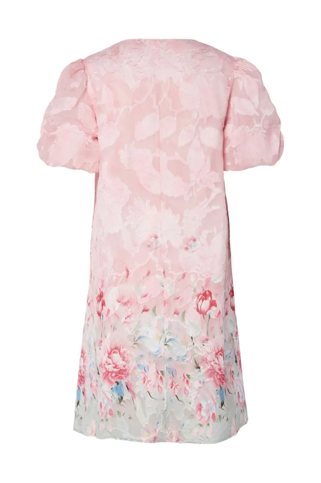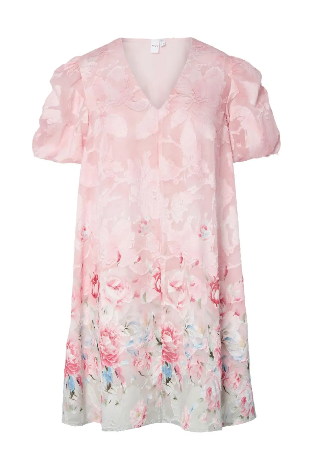 Kort kjole fra Y. A.S med blomstermønster i pink og blå. Kjolen har pufærmer og V-udskæring. Den går til låret og har et gradvist skiftende mønster fra top til bund.