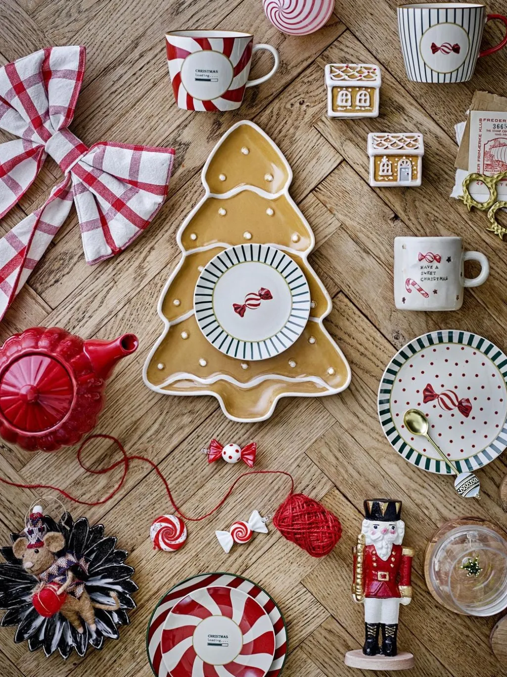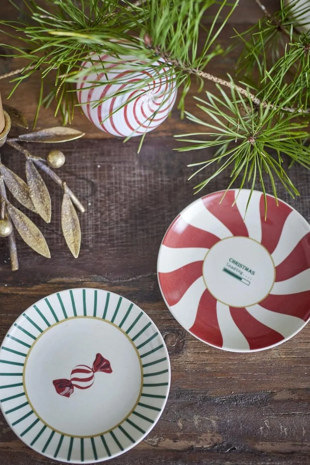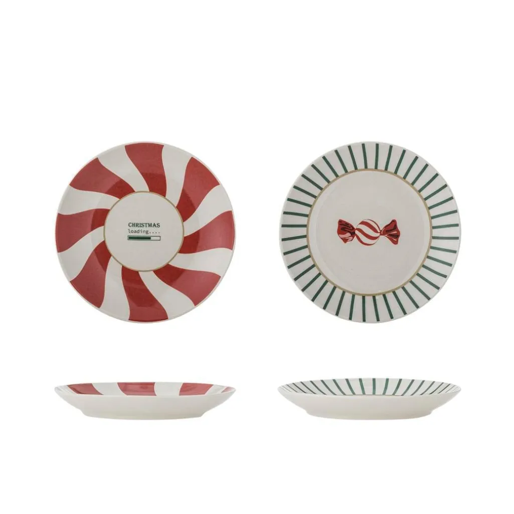 Juletallerkener fra Bloomingville i stentøj med rødt spiralmønster og grønne striber. To forskellige designs med julemotiver på hvid baggrund.