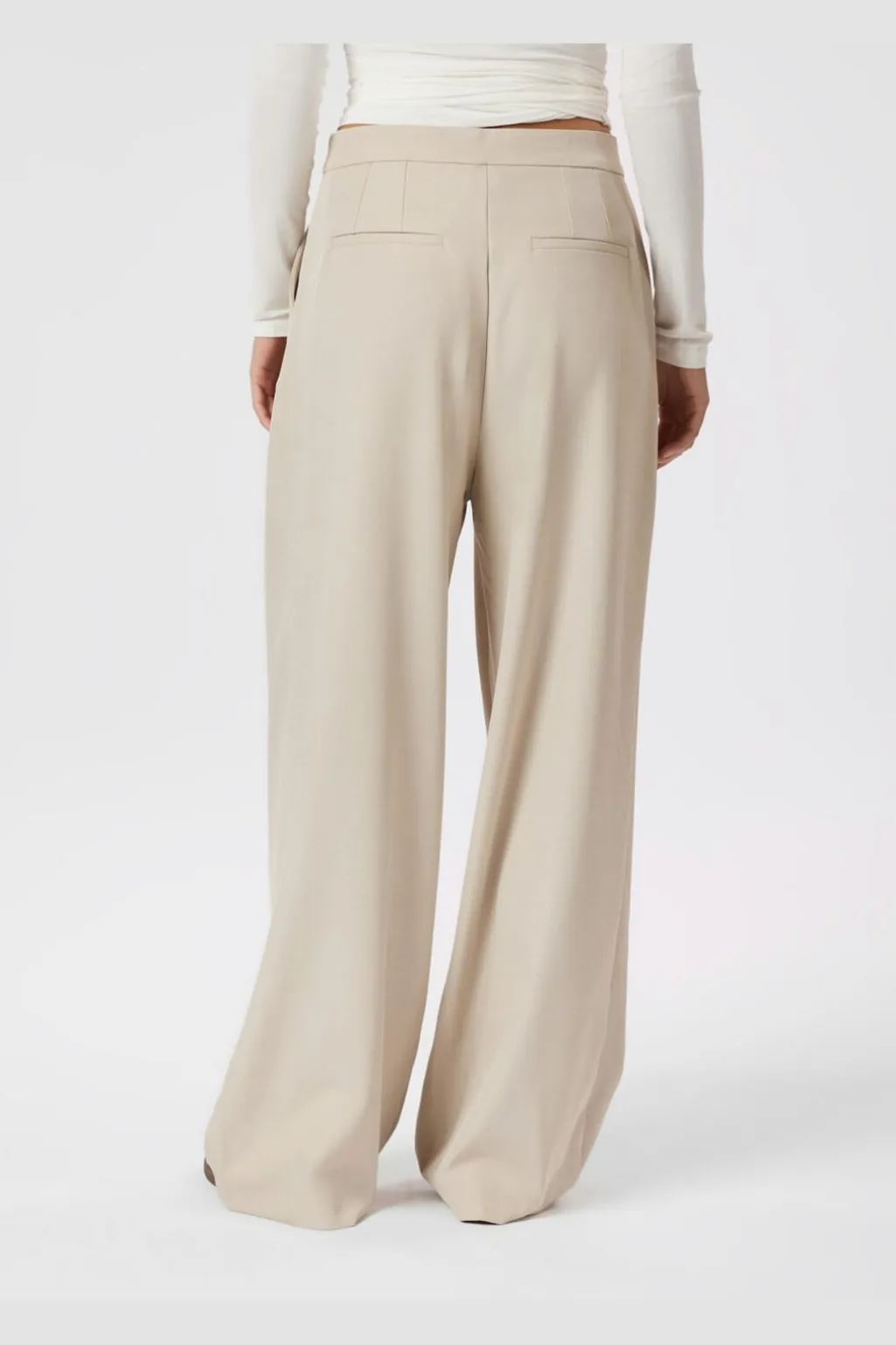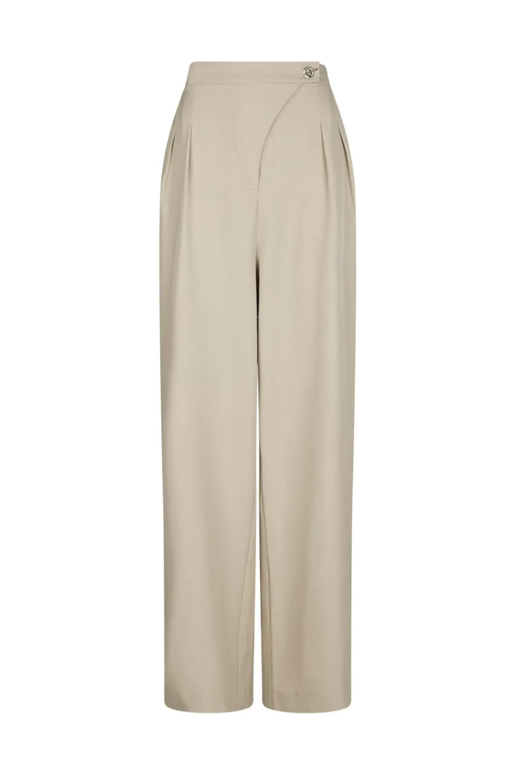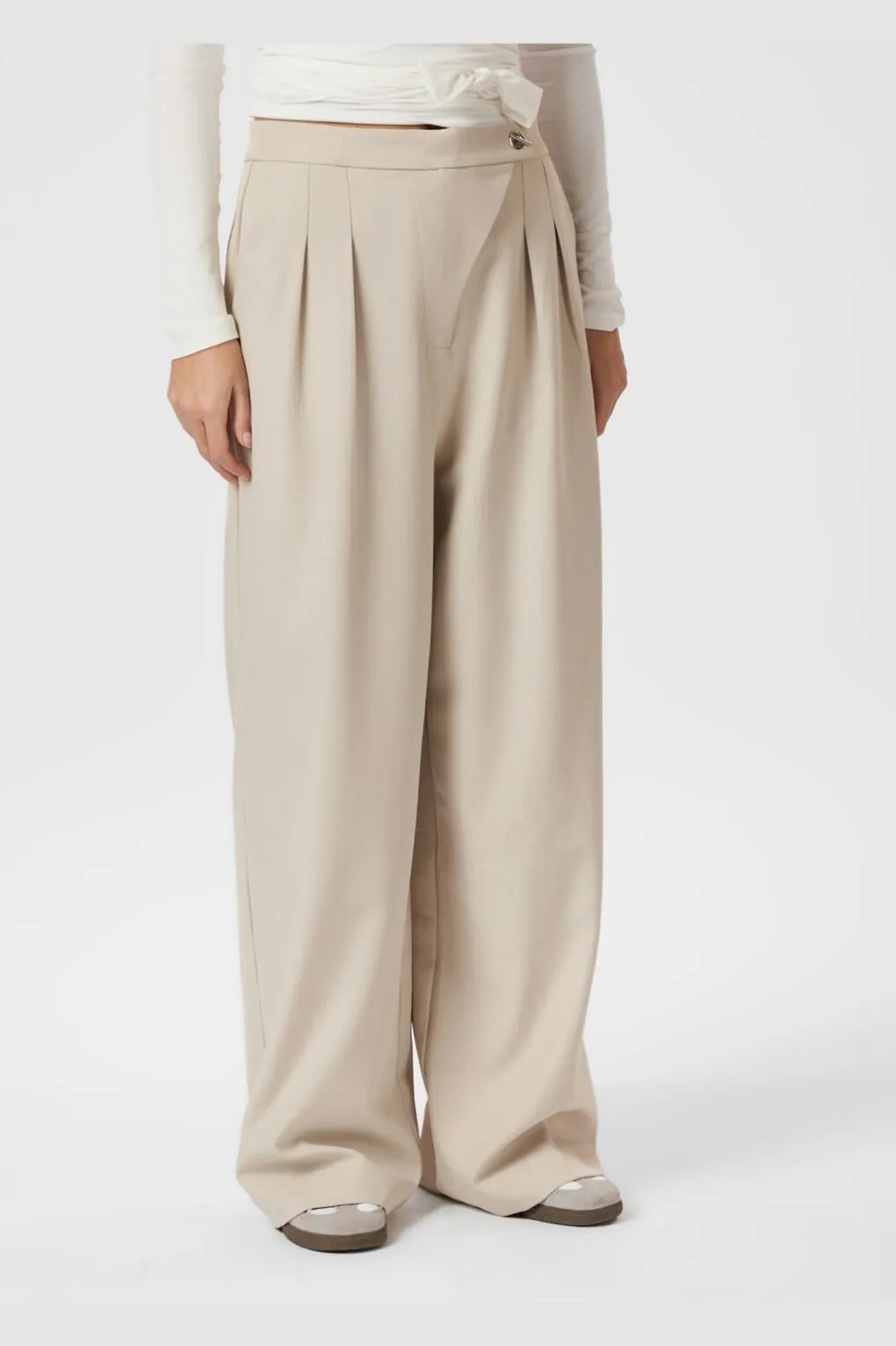 Sandfarvede bukser fra Neo Noir med høj talje og dobbelte læg foran. Bukserne har en øjelet-detalje ved linningen og vide ben med en løs pasform.