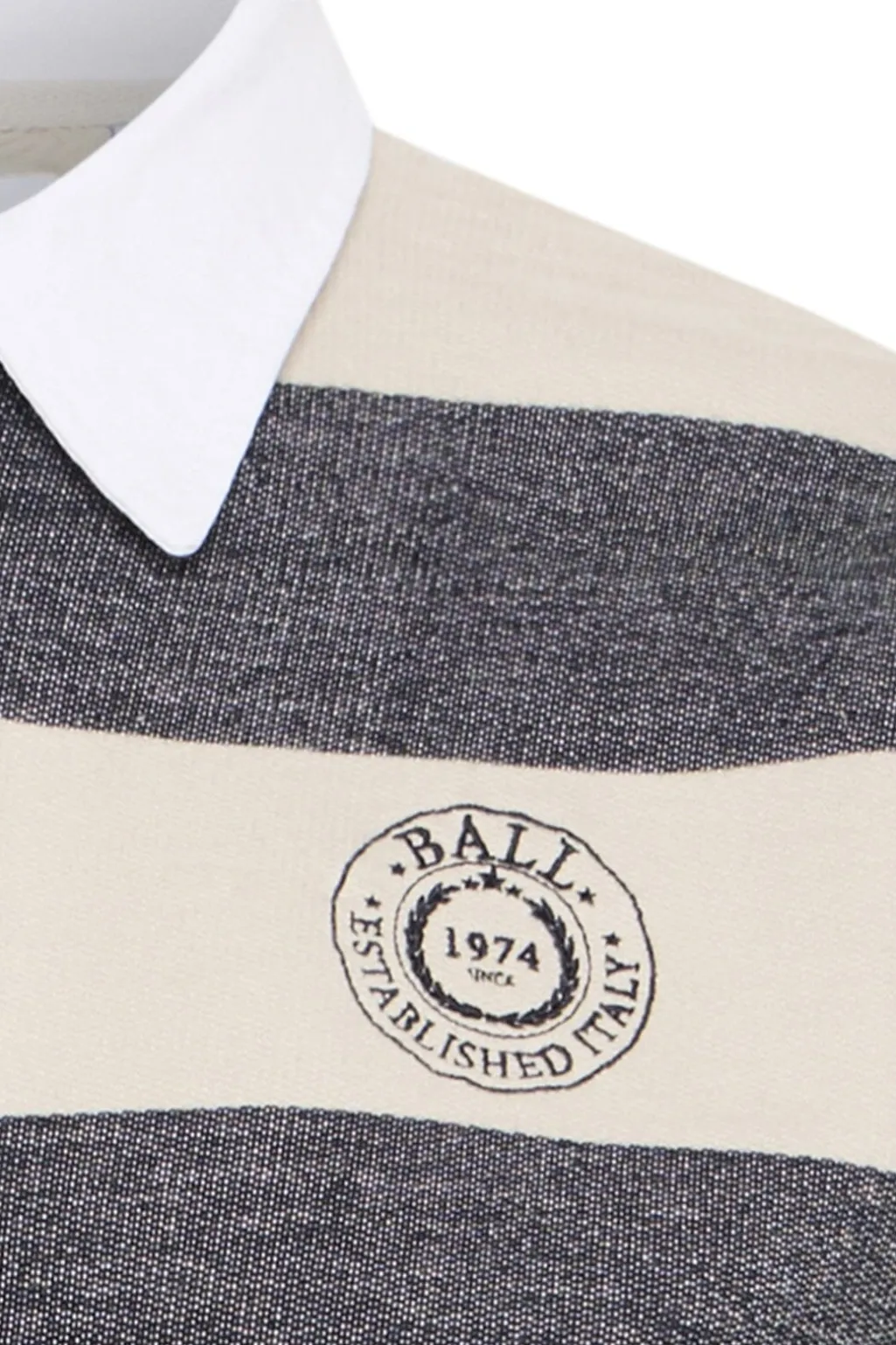 Langærmet poloskjorte fra Ball med striber i beige og mørkegrå. Den har en hvid krave og et broderet logo på brystet.