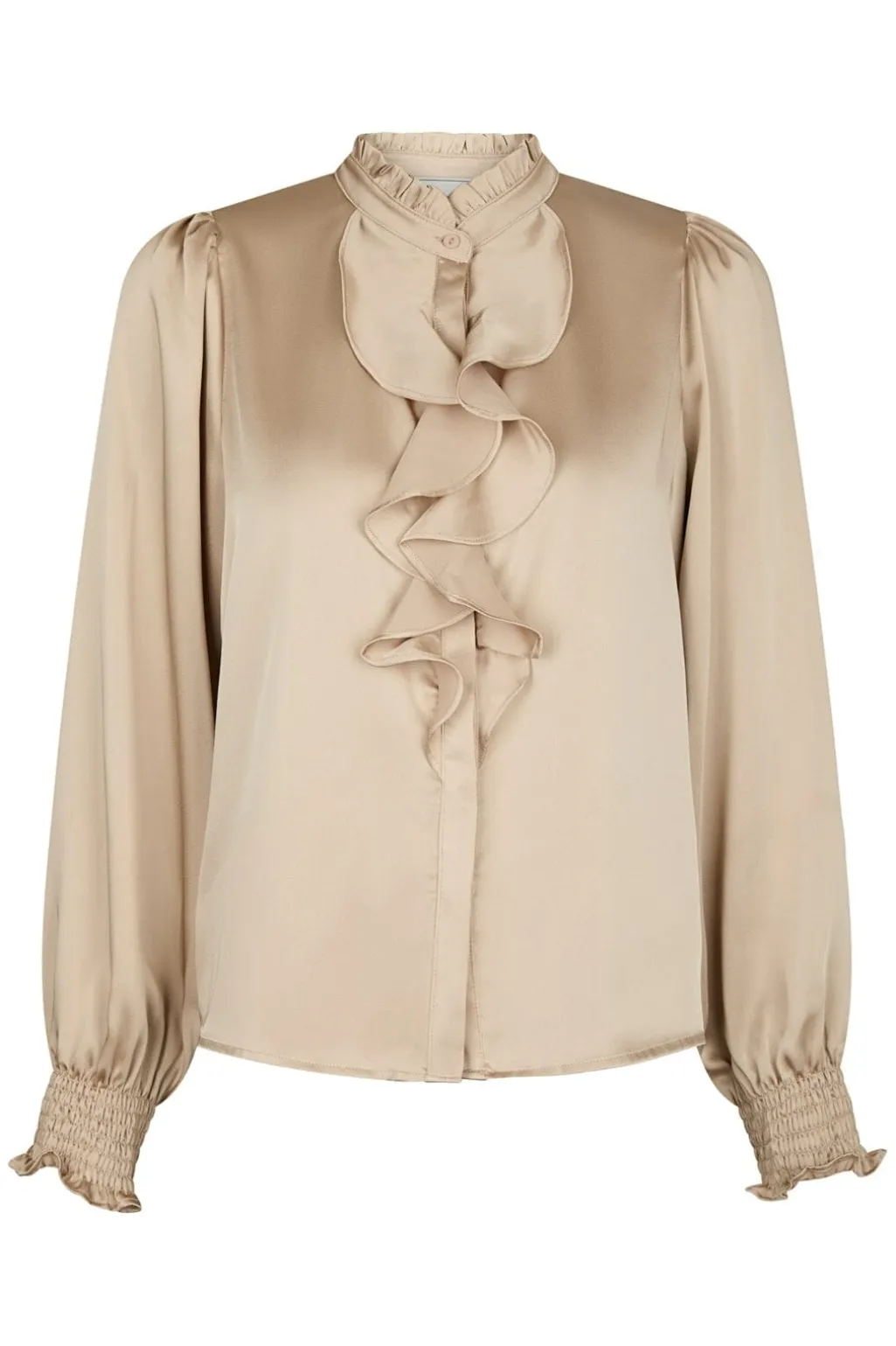 Bluse fra Neo Noir i lys sandfarve, lavet af 100 % polyester. Blusen har flæser ned langs fronten og smock-detaljer ved manchetterne.