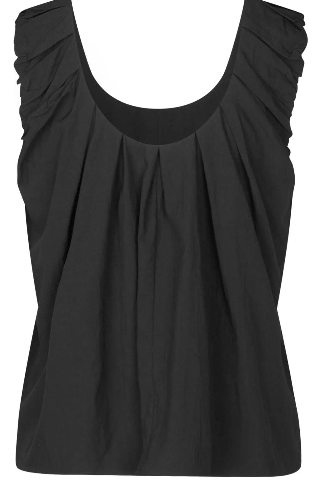 Sort ærmeløs top fra MbyM med flæsedetaljer på skuldrene. Toppen har en rund halsudskæring og samlet stof, der skaber et blødt fald ned over kroppen.
