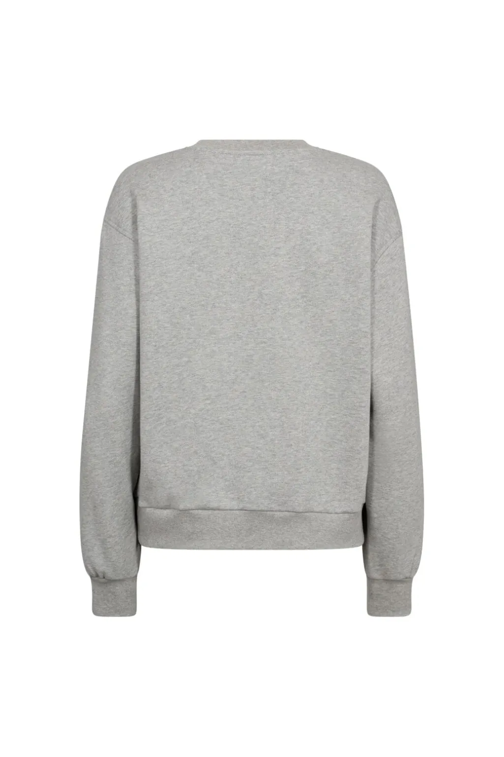 Grå meleret sweatshirt fra Co’Couture med sort broderet logo på forsiden. Den har lange ærmer, rund halsudskæring og ribbede kanter ved ærmerne og taljen.