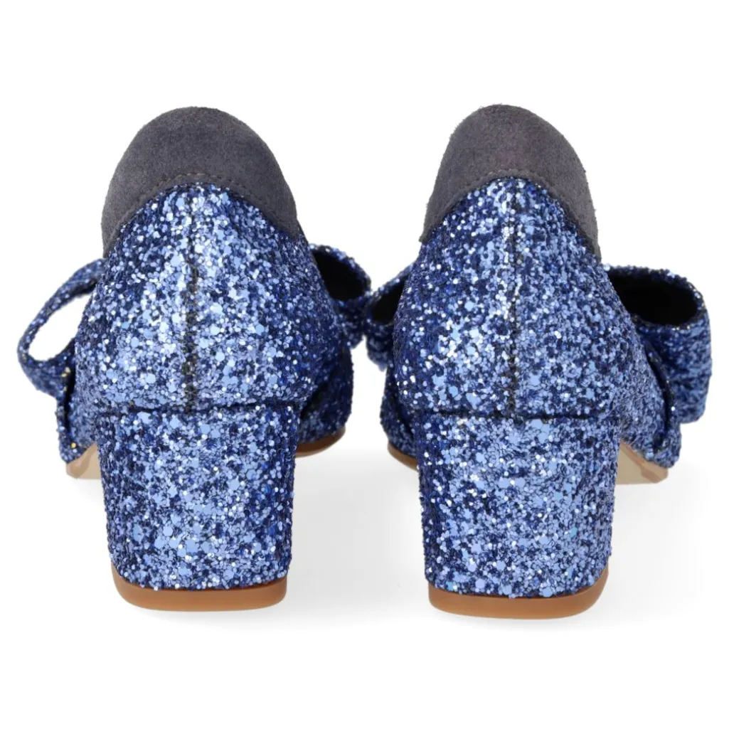 Stiletter fra Angulus i mørkeblå med glitter. Skoene har spids tå, skindfor og sløjfedetaljer, der gør dem velegnede til festlige anledninger.