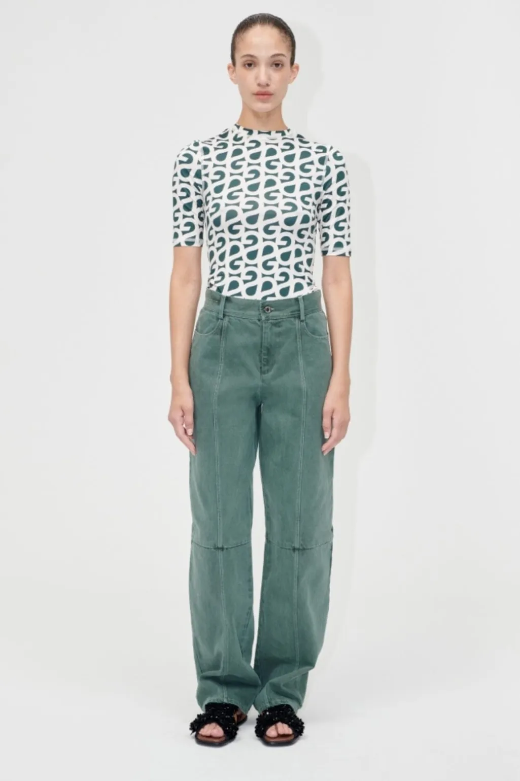Skovgrøn t-shirt fra Stine Goya med korte ærmer og all-over logoprint i hvid. T-shirten har en høj hals og tætsiddende pasform, der følger kroppens form.