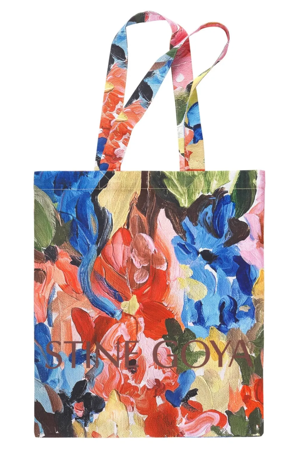 Tote bag fra Stine Goya i økologisk bomuld med et farverigt blomstermønster i blå, orange og grønne nuancer. Tasken har to håndtag og en rummelig størrelse.