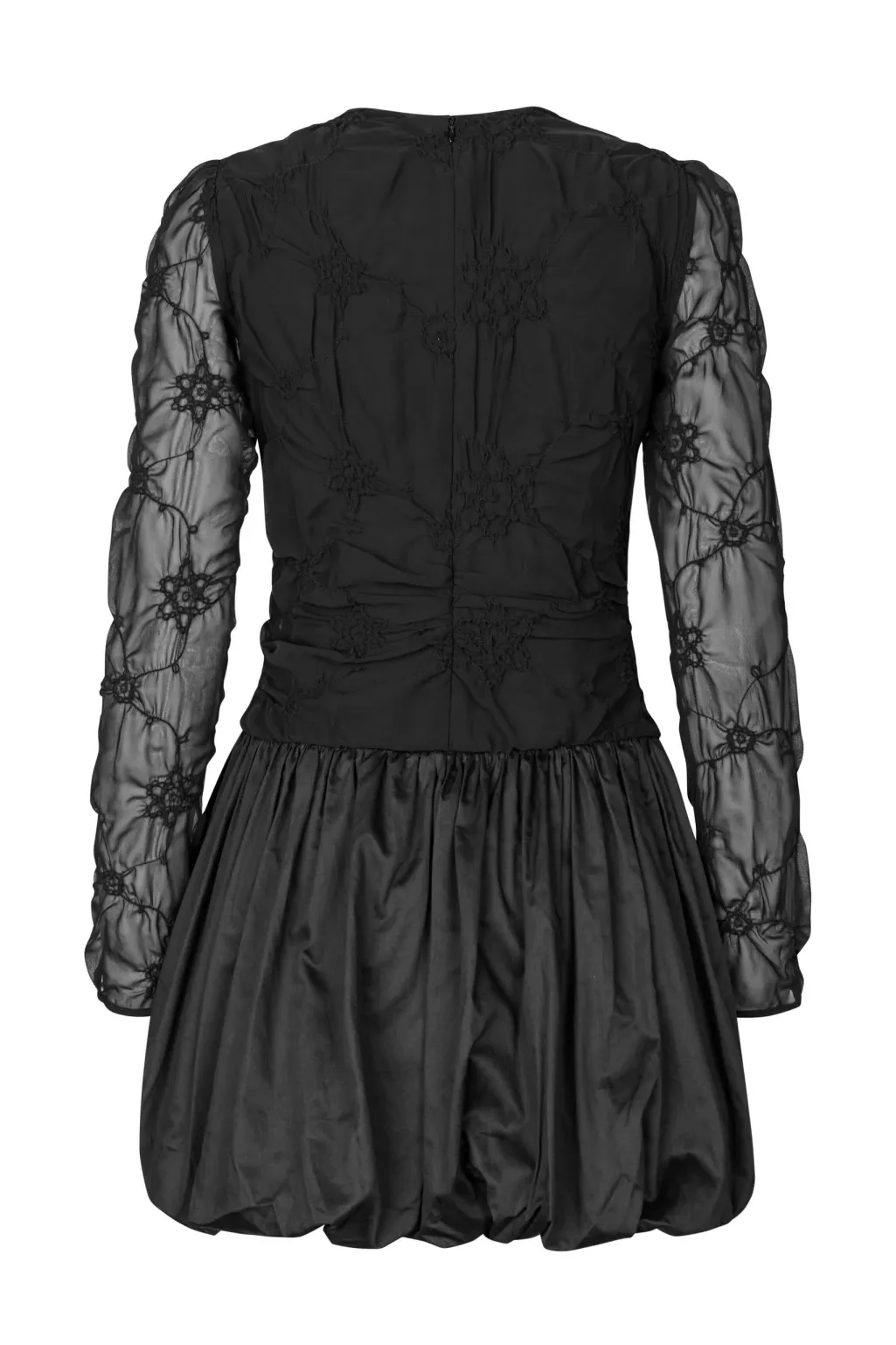 Sort kjole fra Stine Goya med smock-design og blomsterbroderi. Kjolen har gennemsigtige ballonærmer med blomsterdetaljer og en kort, ballonformet nederdel.