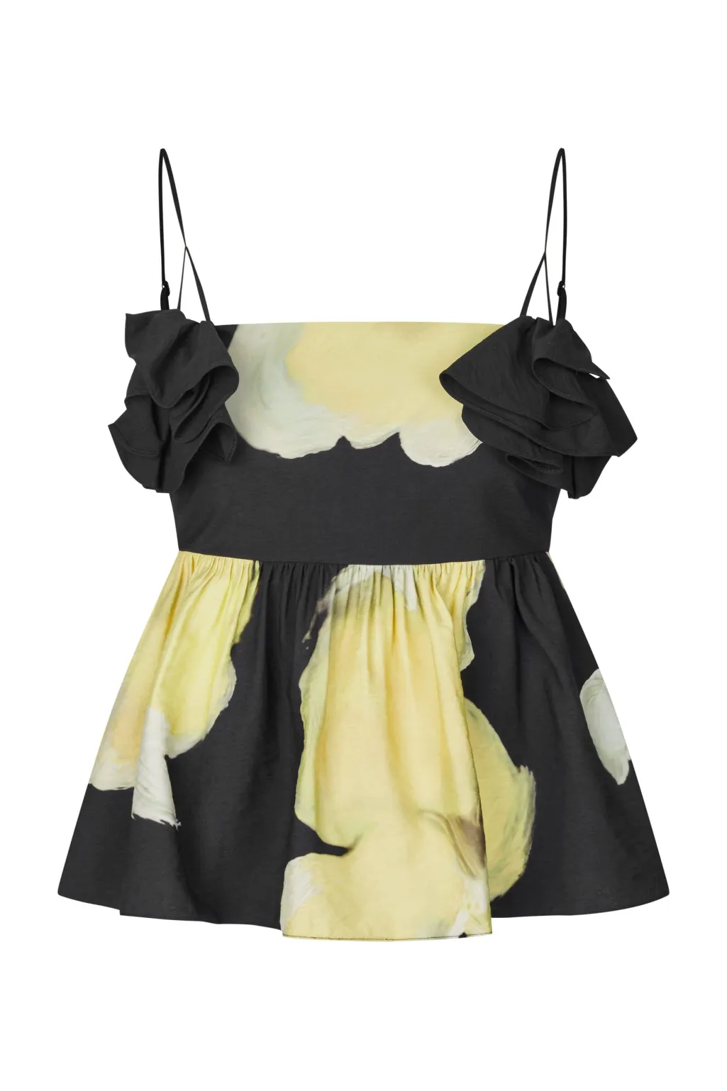 Peplumtop fra Stine Goya med gult blomsterprint på sort baggrund. Toppen har tynde spaghettistropper og flæser ved taljen.
