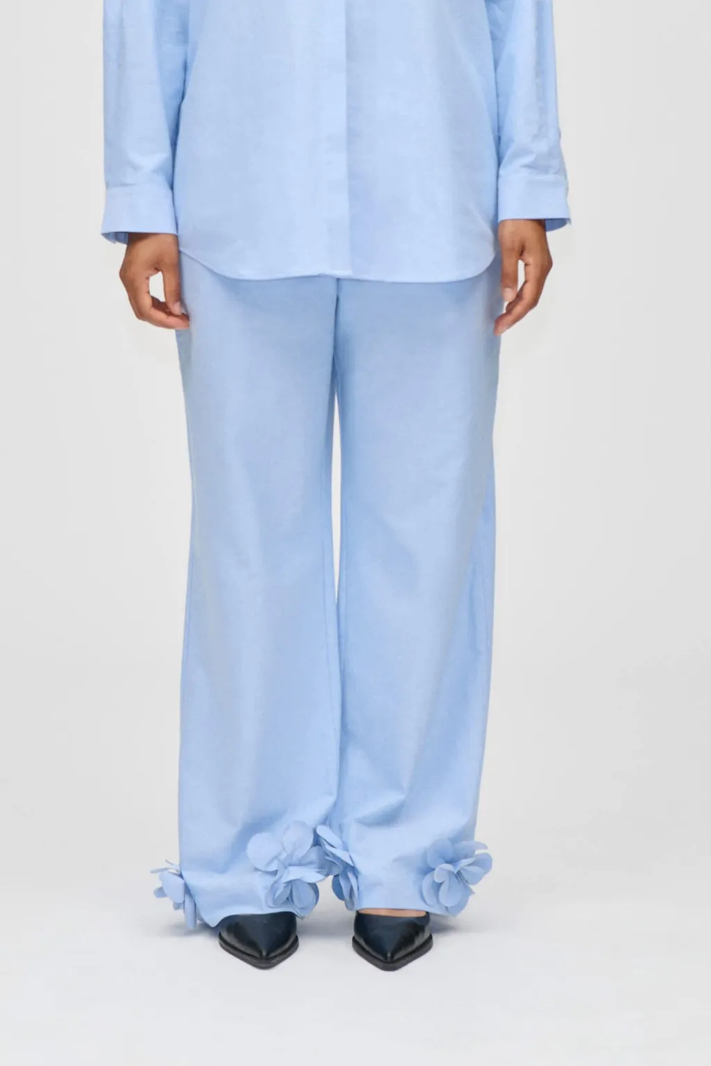 Lange bukser fra Stine Goya i lyseblå 100% økologisk bomuld. Bukserne har blomsterdetaljer ved buksekanten og en løs pasform med elastisk talje.