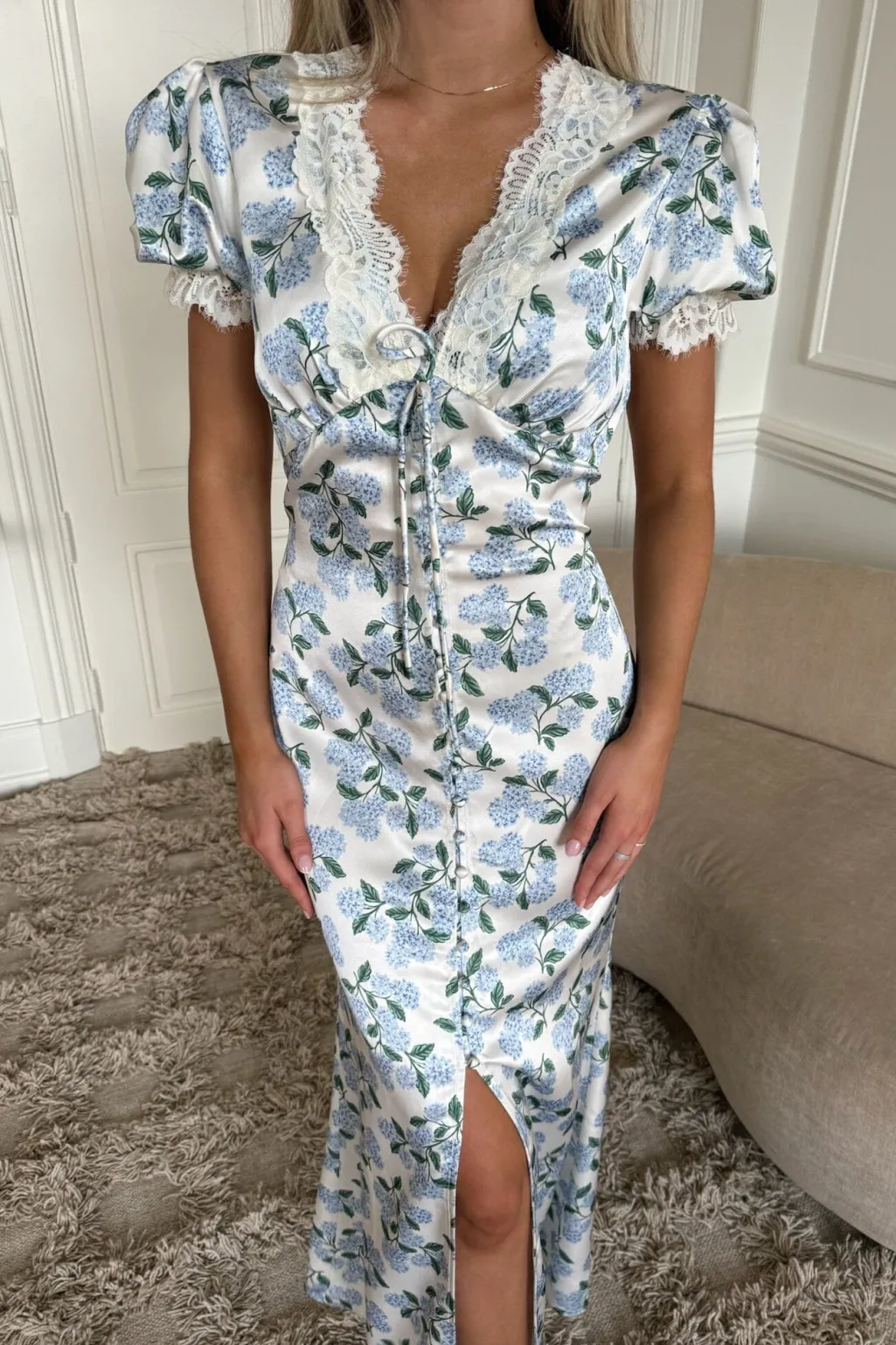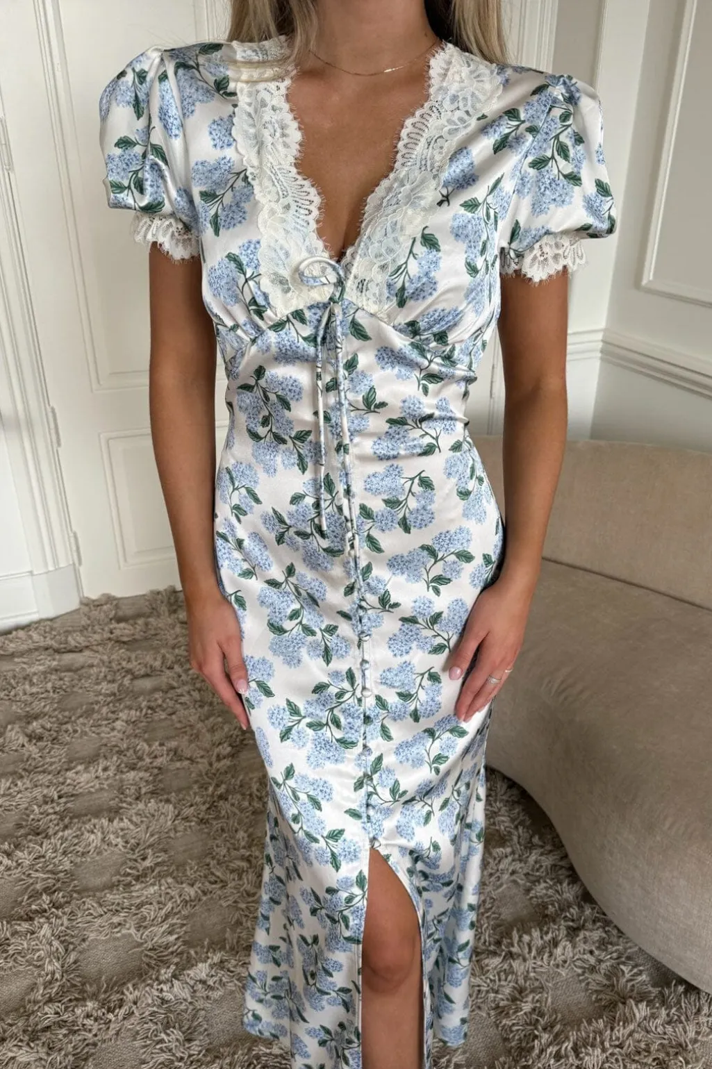 Lang kjole fra BYIC med blåt hortensia-mønster på hvid bund. Kjolen har pufærmer og V-hals med blondedetaljer samt en slids foran.