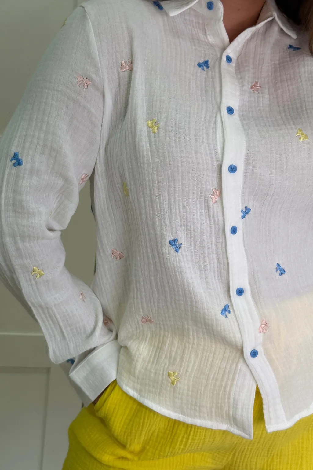 Hvid skjorte fra A-bee med broderede motiver i blå, lyserød og gul. Skjorten har blå knapper og en løs pasform med skjortekrave.