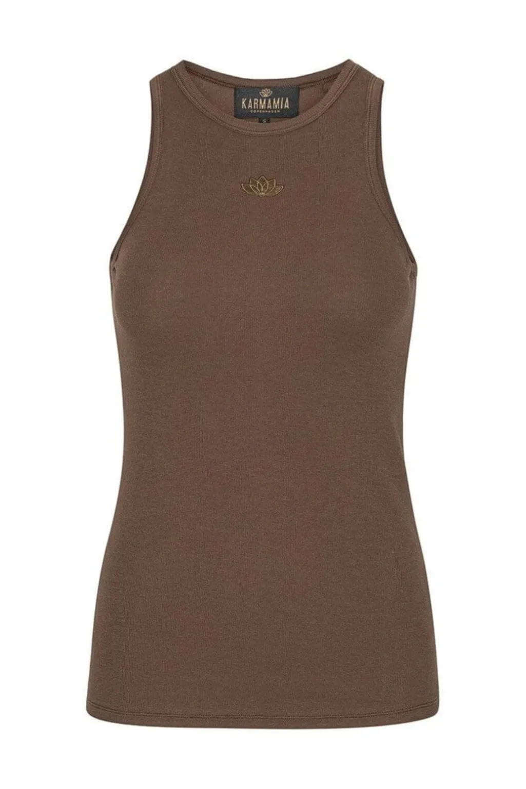 Brun tanktop fra Karmamia med rund halsudskæring. Toppen har et broderet lotusblomst-logo i guld og er lavet af Oeko-Tex®-certificeret Pima-bomuld.