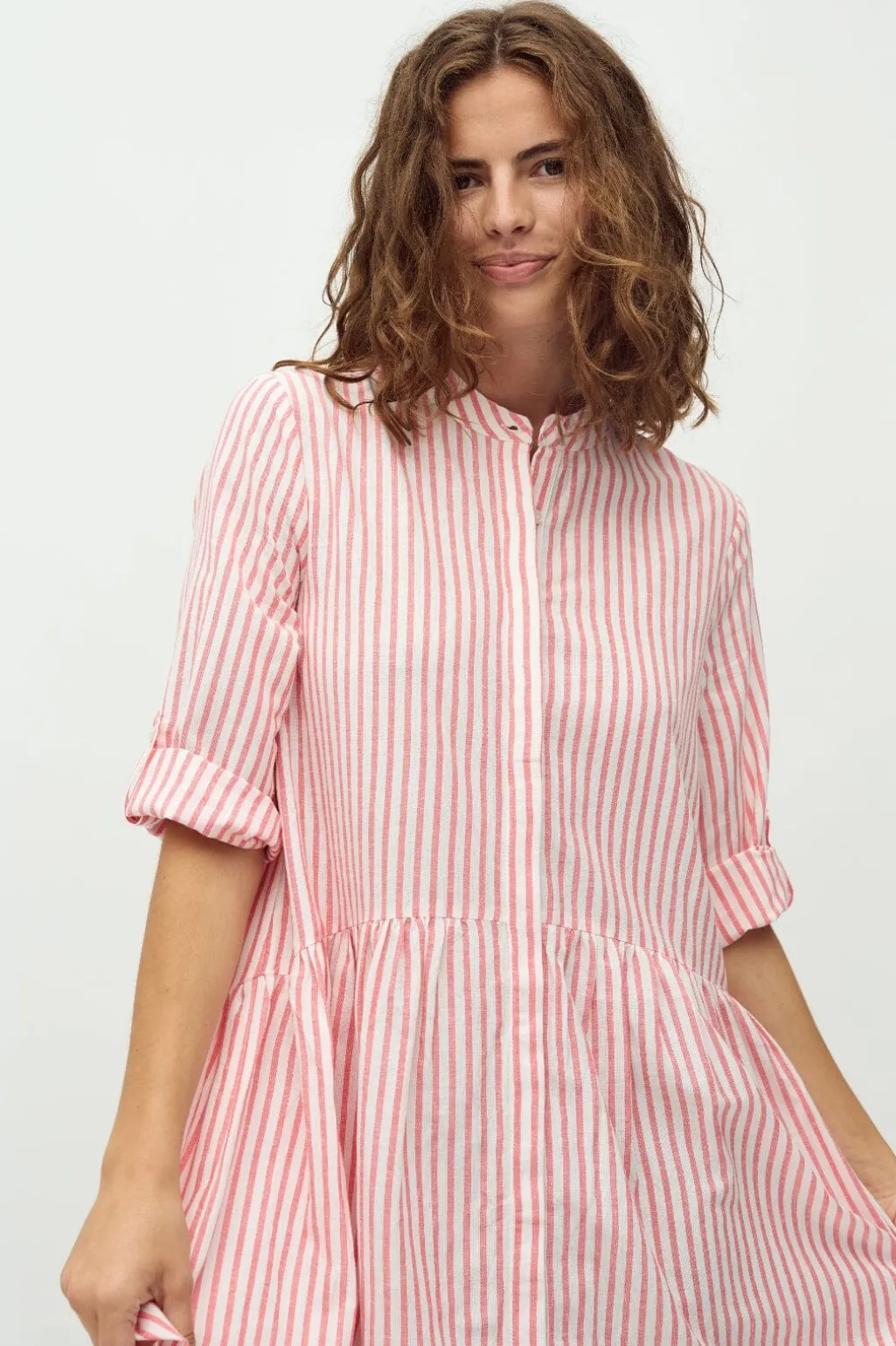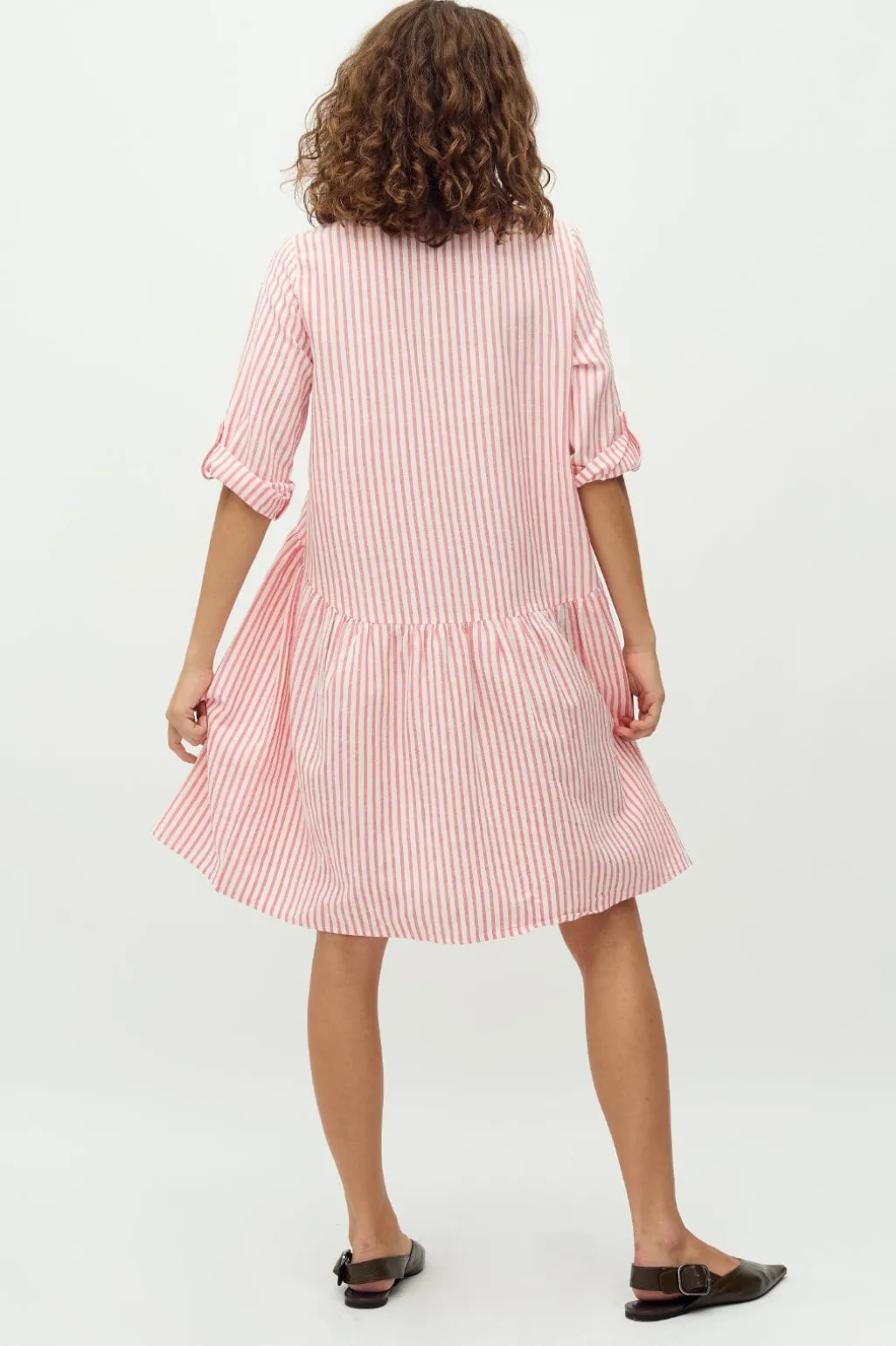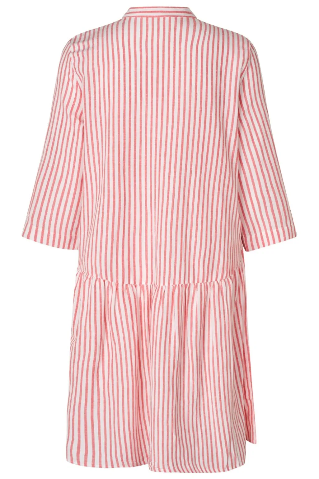Stribet kjole fra MbyM med skjortekrave og knaplukning foran. Den har en samlet talje og trekvartlange ærmer. Kjolen kommer i koral og hvide striber.