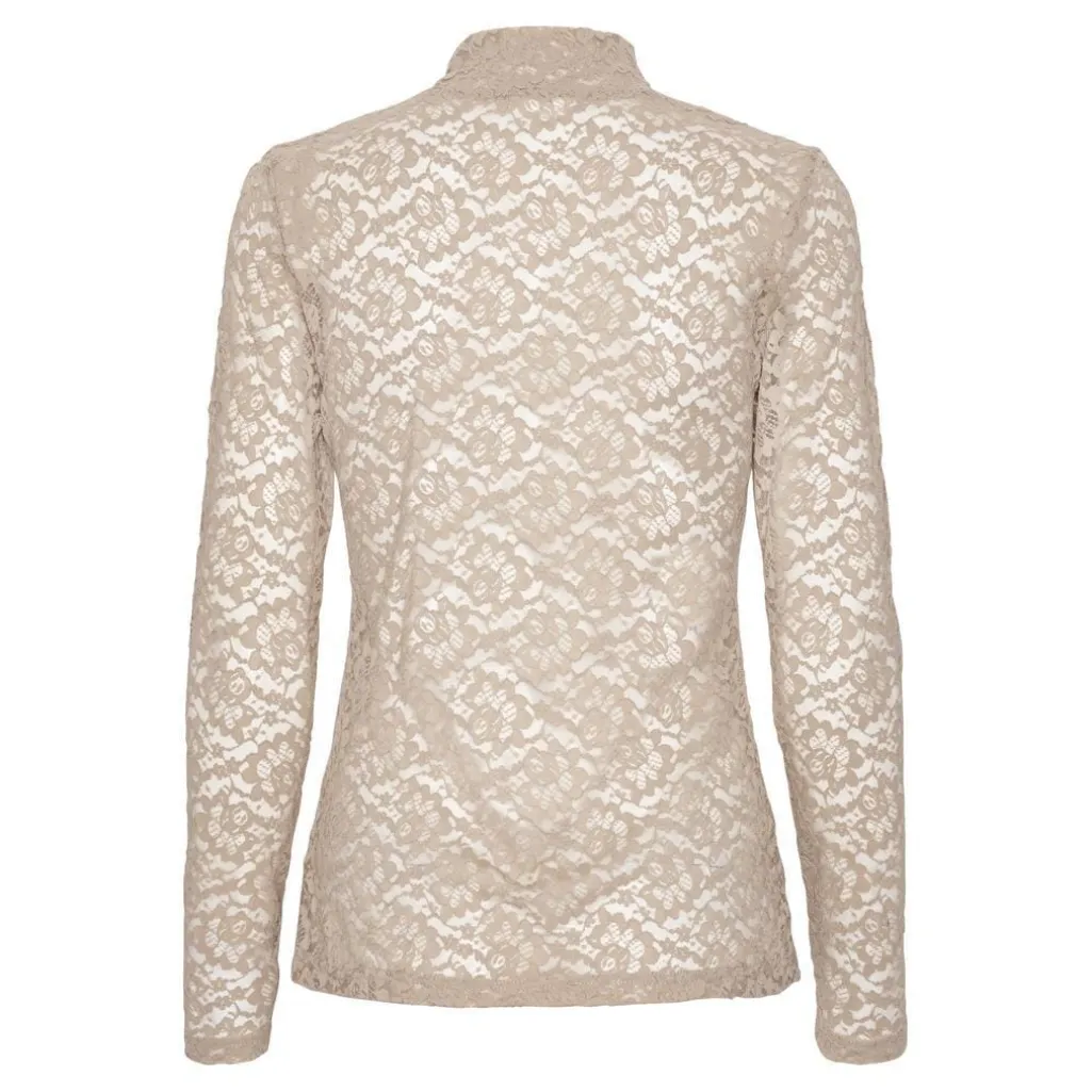 Blondebluse fra Continue i nude farve. Blusen har et blondemønster med blomster, der dækker hele stoffet. Den høje halsudskæring og den kropsnære pasform giver blusen et klassisk udtryk.