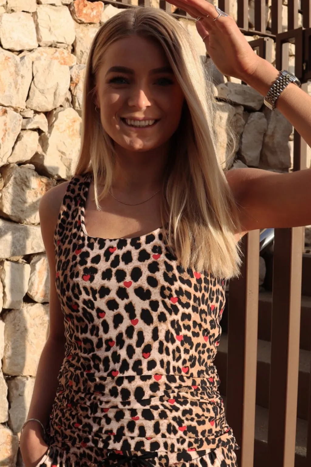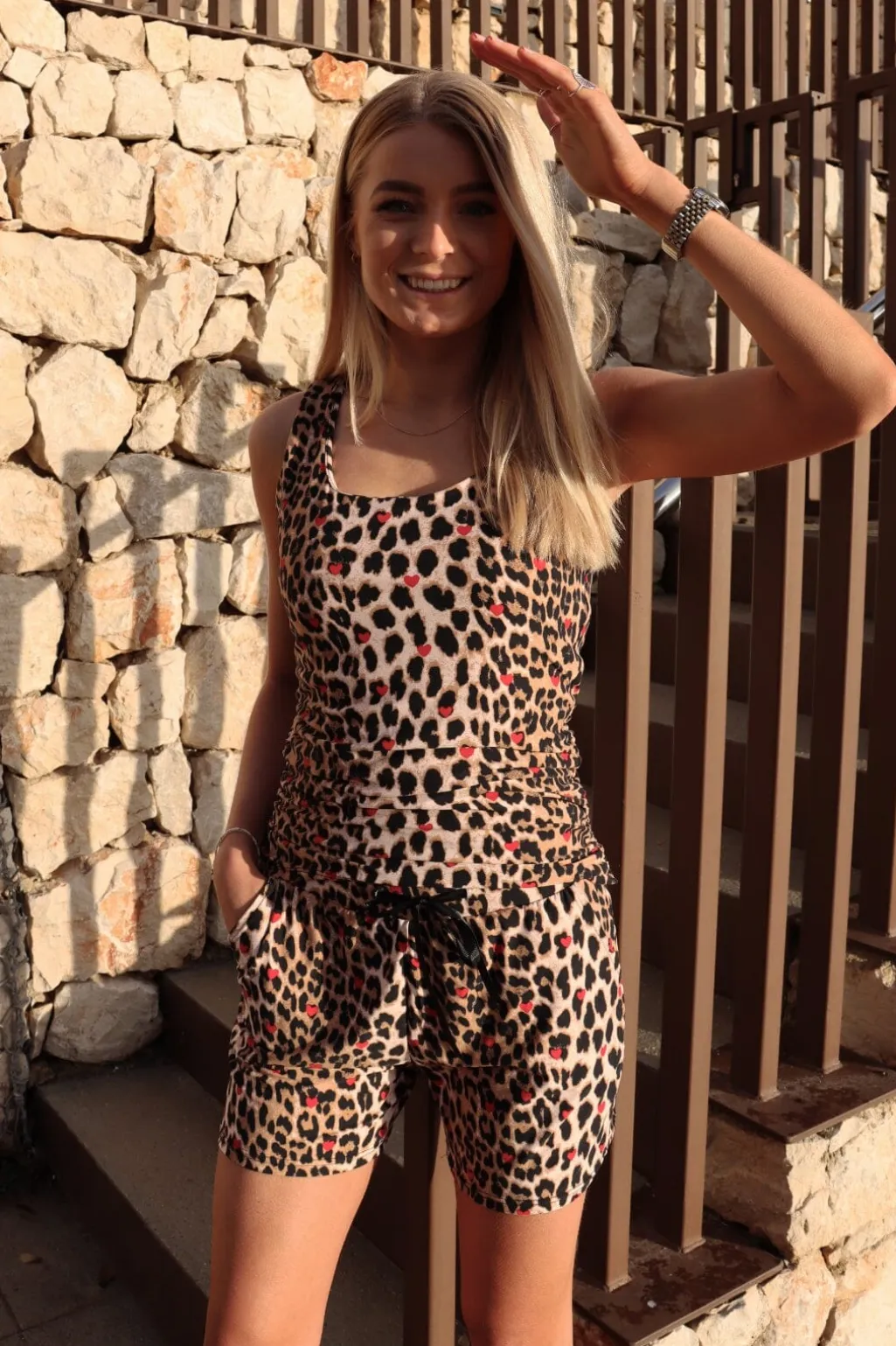 Ærmeløs top fra Liberte med leopardprint og røde hjerter. Toppen har en firkantet halsudskæring og flæsedetaljer, der giver den et særligt præg.