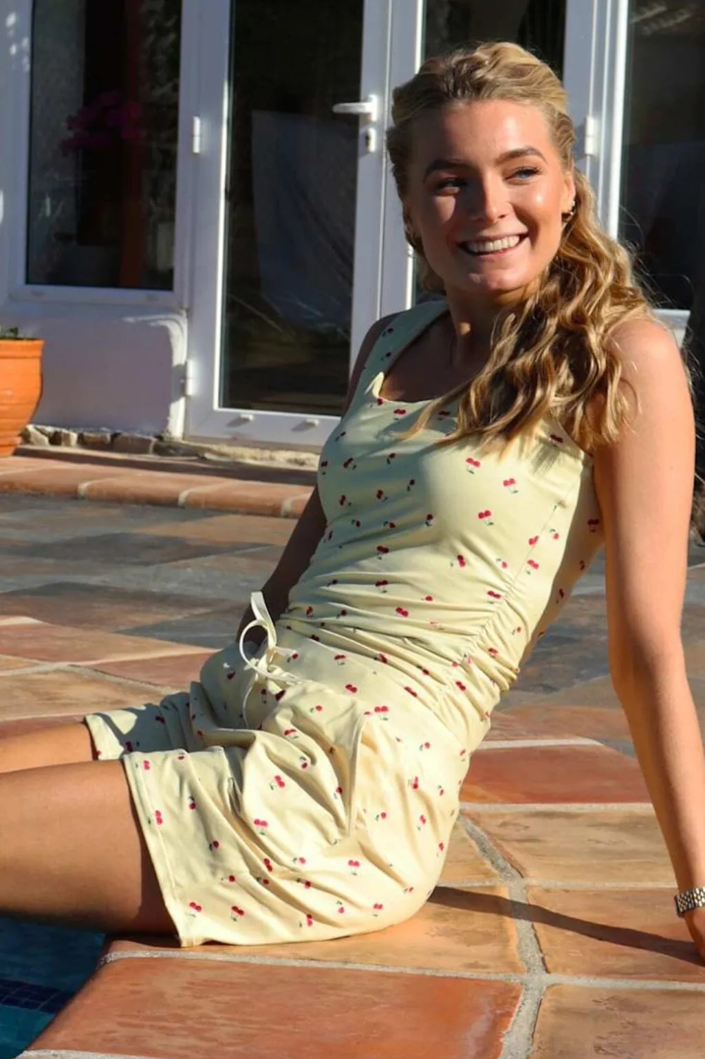 Ærmeløs top fra Liberte med lys gul baggrund og kirsebærprint. Toppen har en rund halsudskæring, bindebånd i siderne og flæsedetaljer.