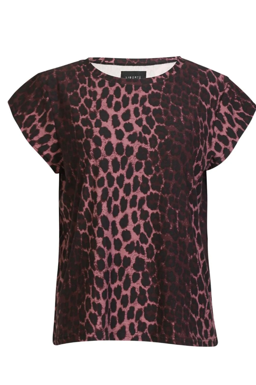 T-shirt fra Liberte med leopardmønster i bordeaux og sorte nuancer. Mønsteret giver t-shirten et grafisk udtryk med kontrast mellem de mørkerøde og sorte pletter.