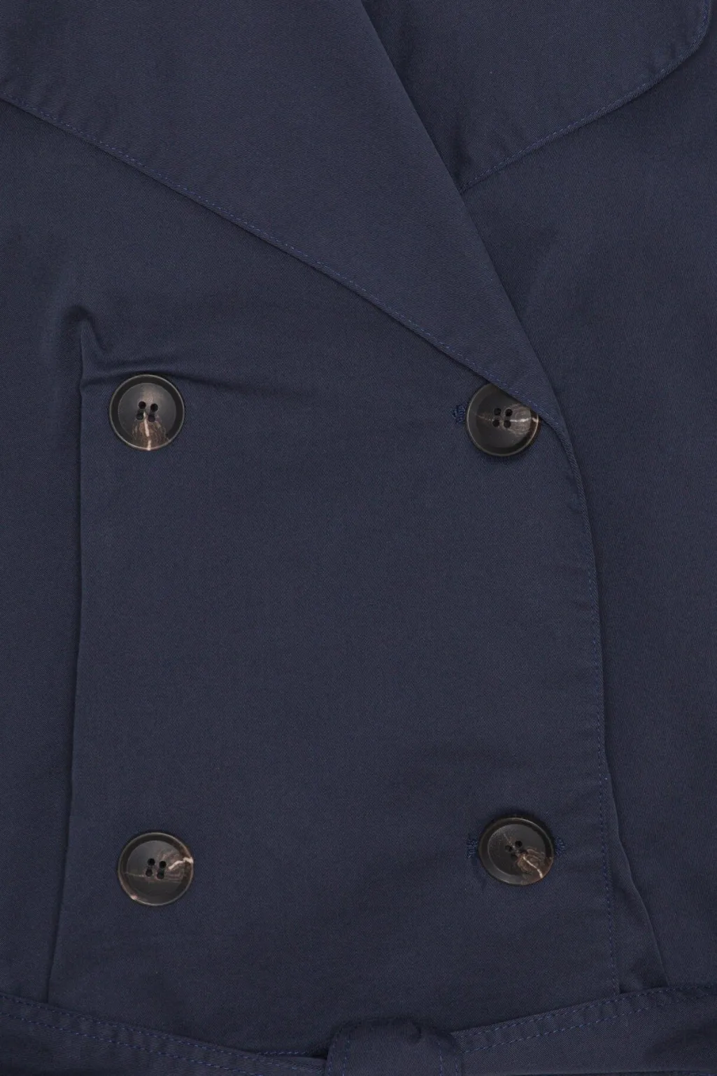 Mørkeblå trenchcoat fra BYIC med dobbeltbrystet front og store knapper. Jakken har en bred krave og et bælte i taljen, som kan justeres efter behov.