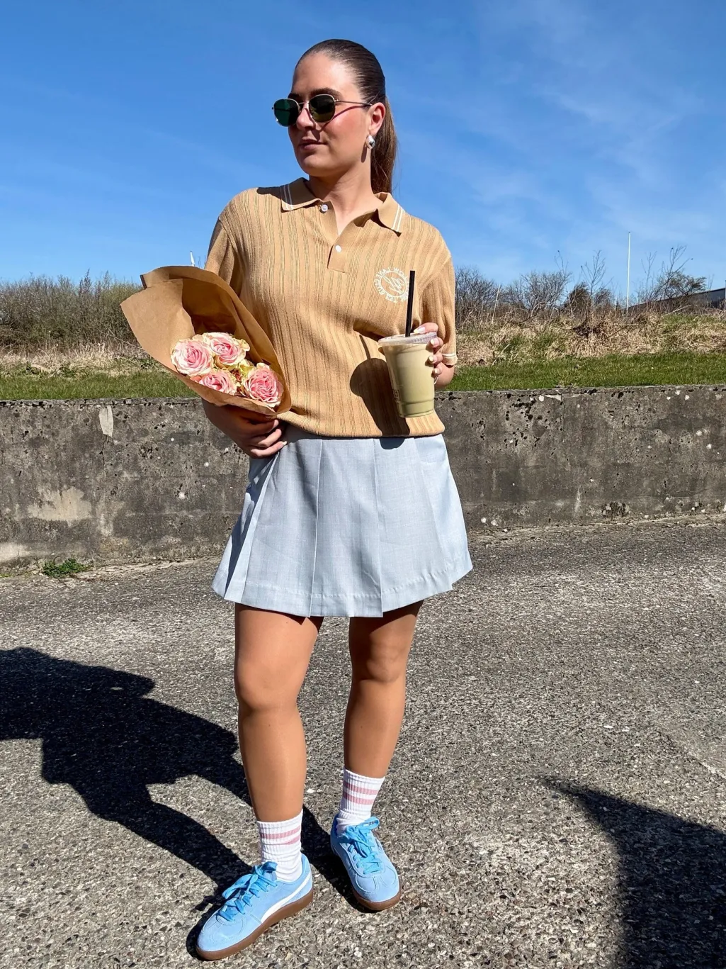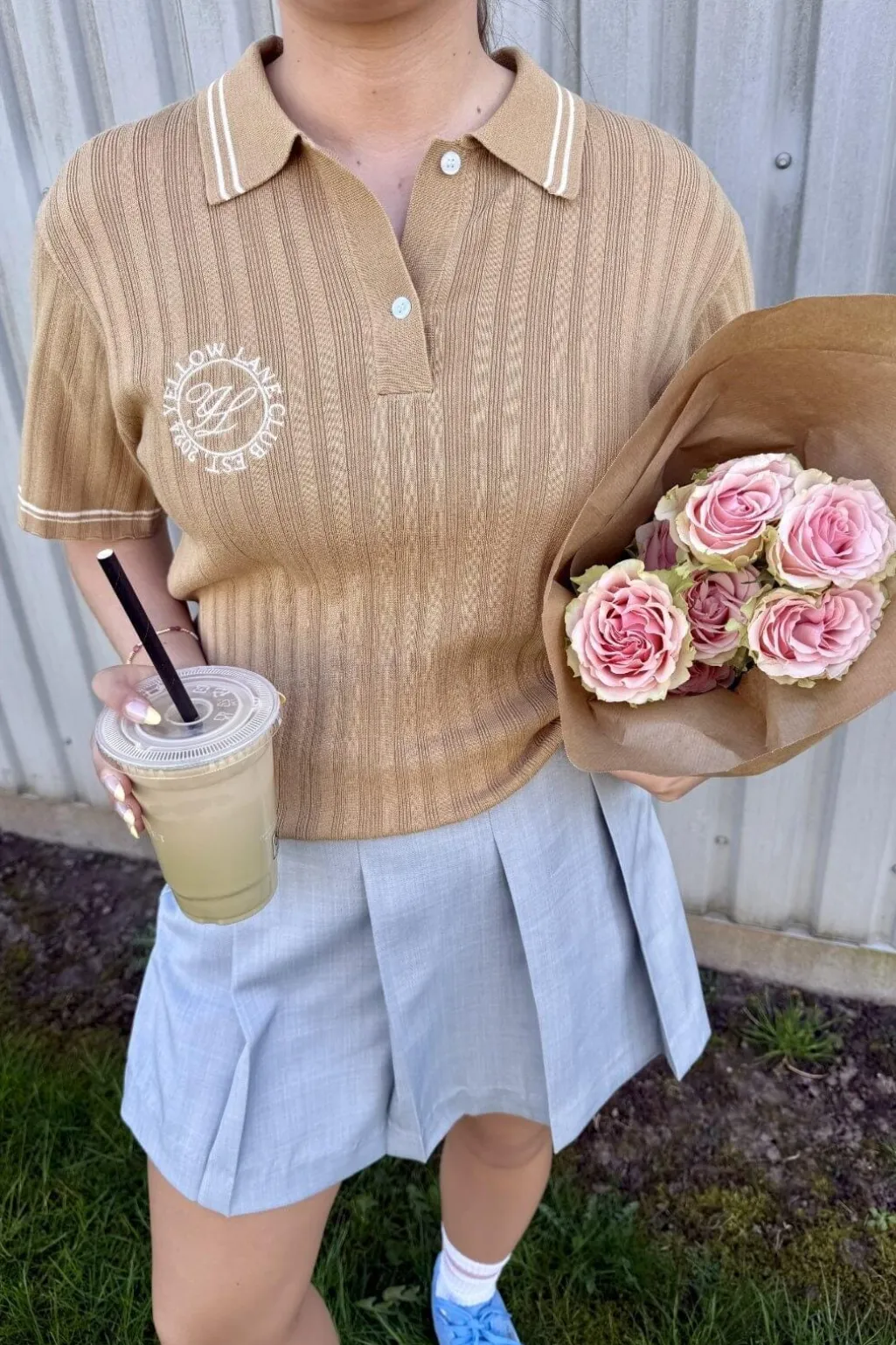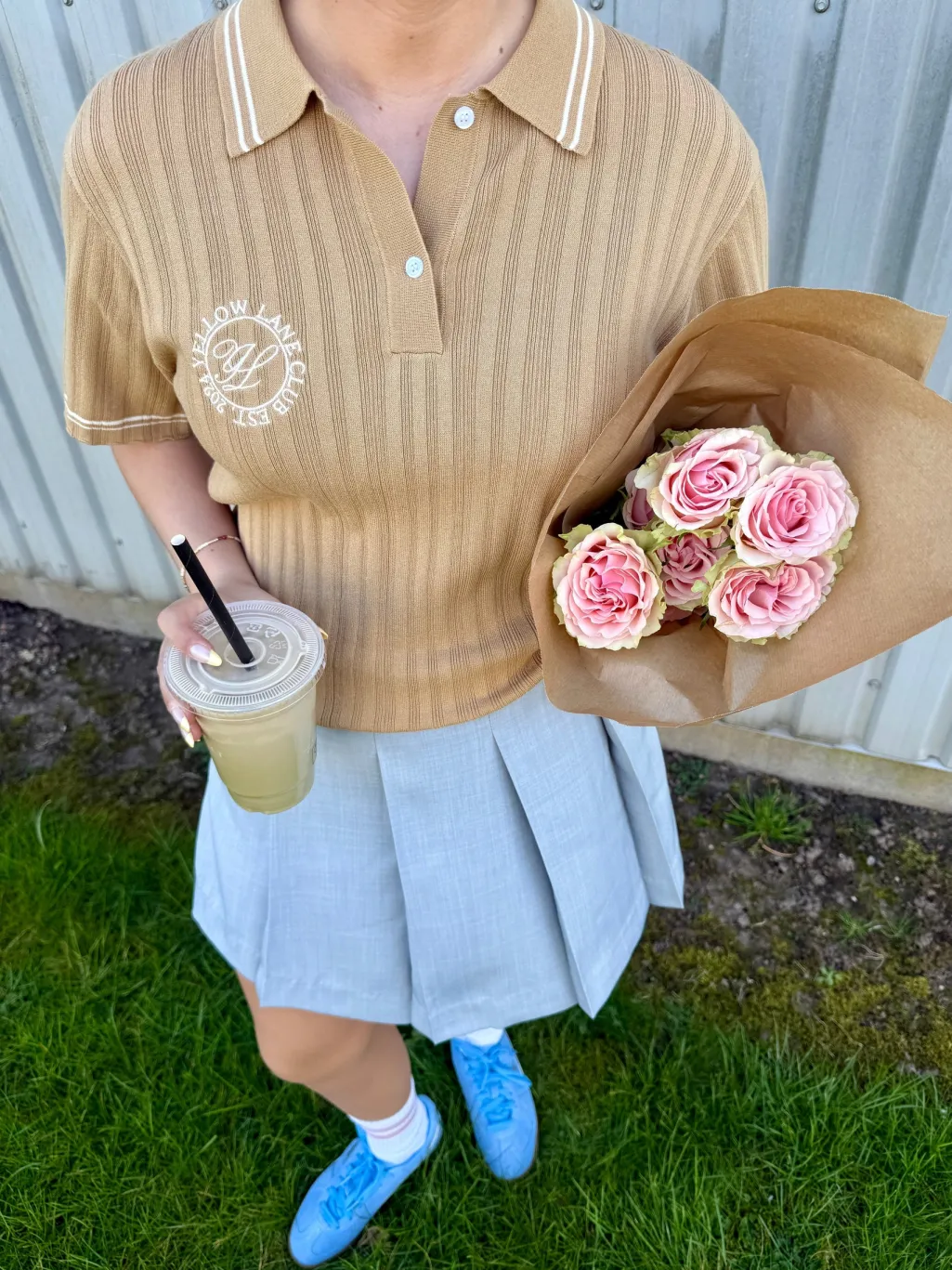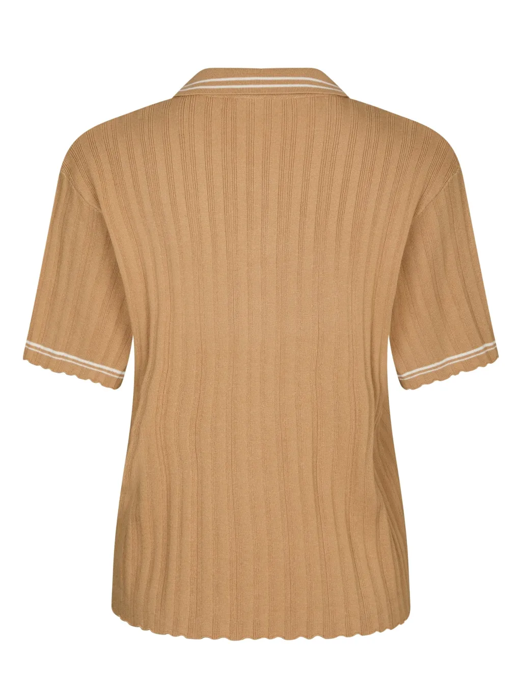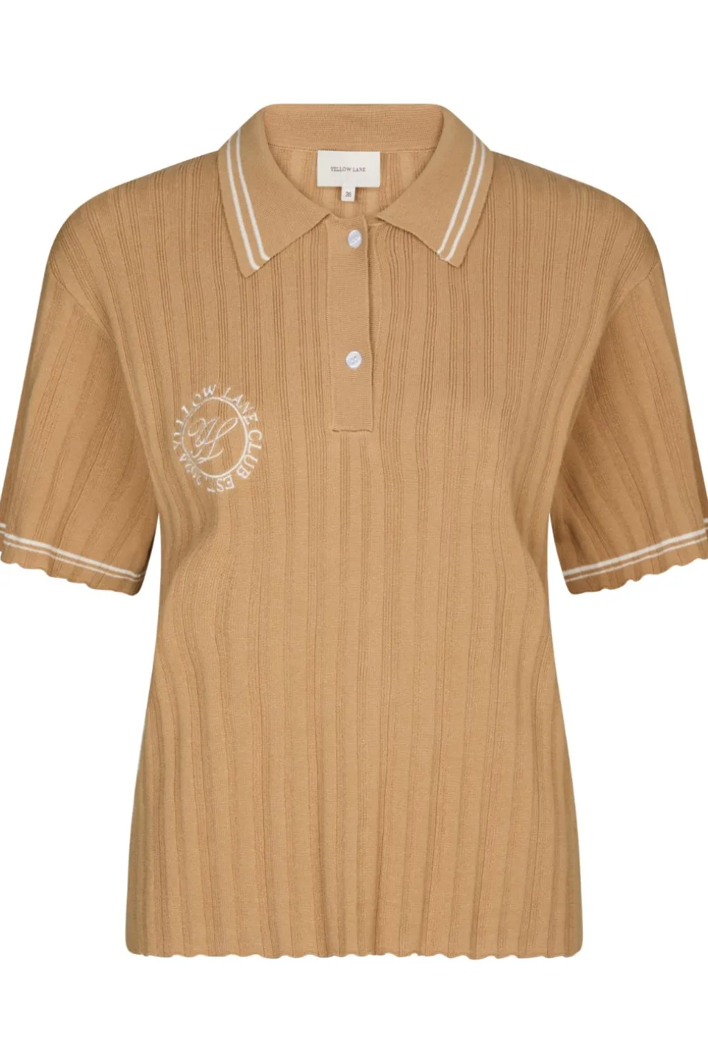 Karamelfarvet polo fra Yellow Lane med ribbet tekstur. Den har korte ærmer og en klassisk polokrave med hvide striber. På venstre side sidder et broderet klublogo.