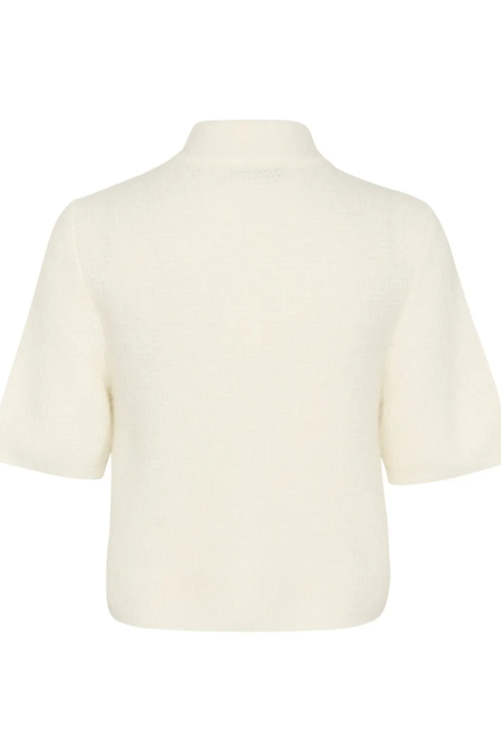 Kort cardigan fra Gestuz i ivory med høj hals og korte ærmer. Den er lavet af en blanding af uld og polyester med stretch og har knapper hele vejen ned foran.