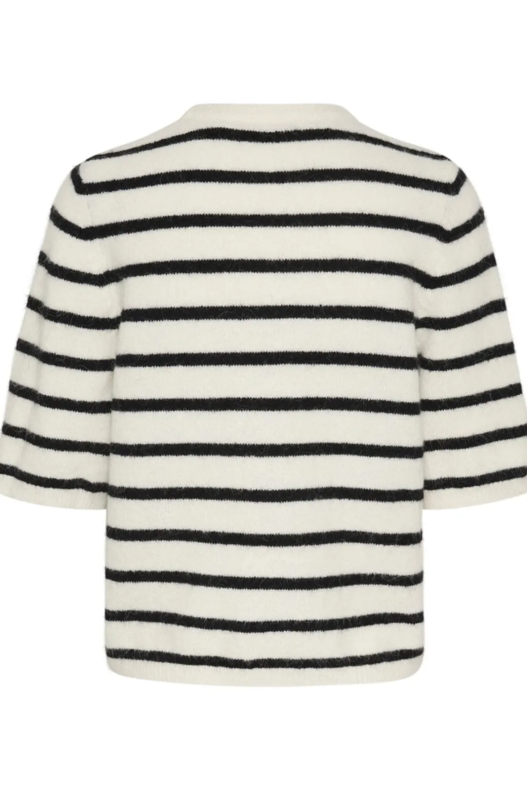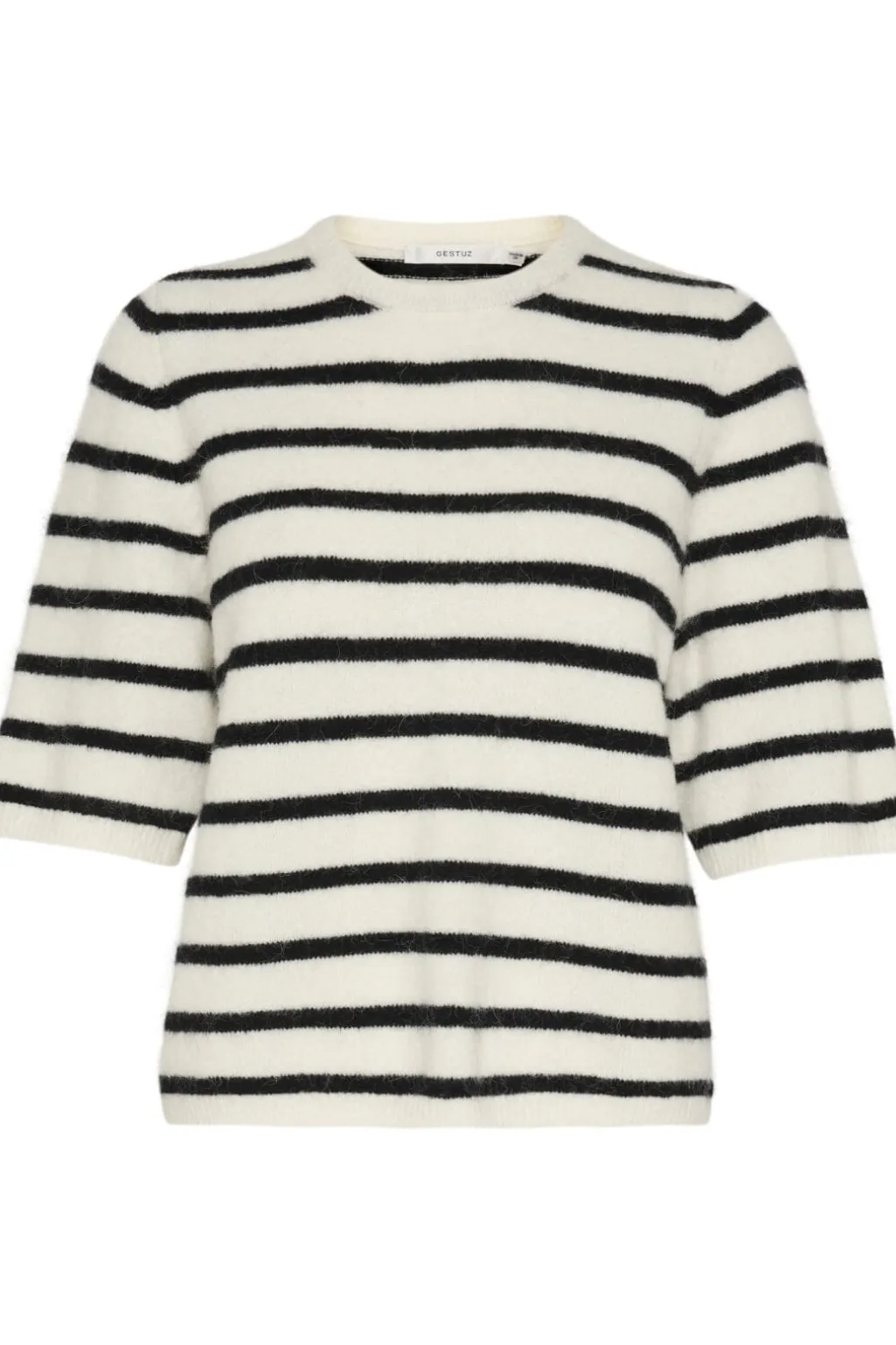 Stribet bluse fra Gestuz med sort-hvide striber. Blusen har 3/4-ærmer og rund hals. Den er lavet af en blanding af naturlige og strækbare materialer.