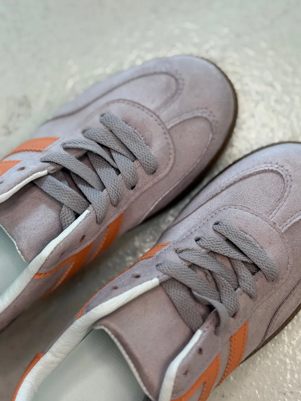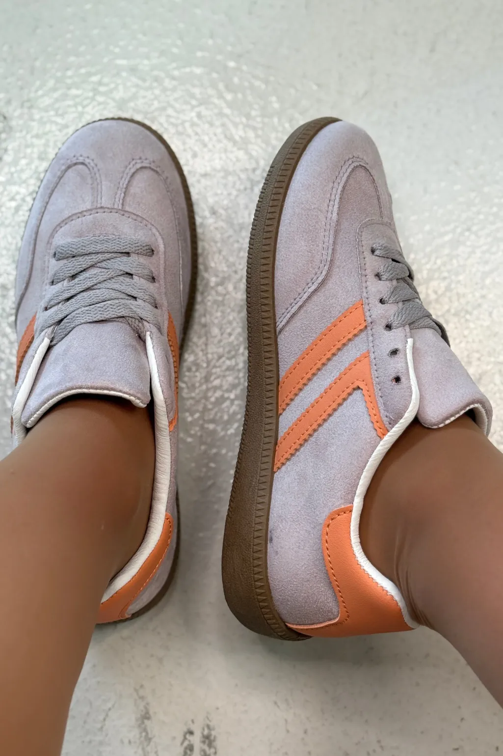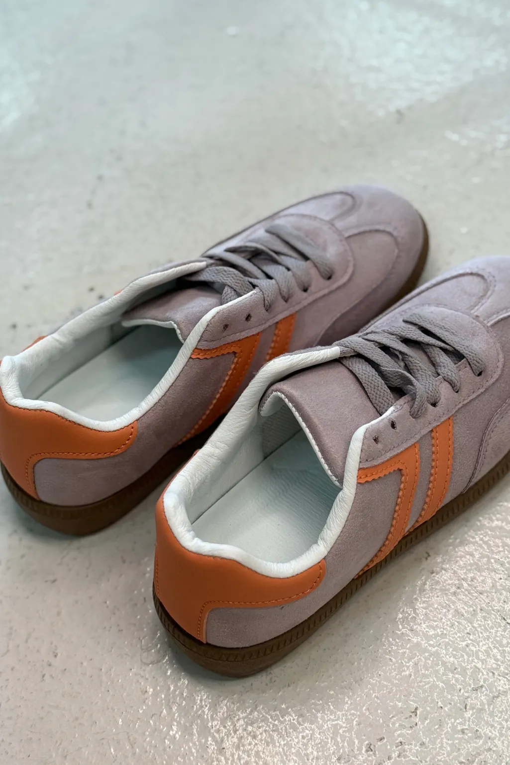 Sneakers fra Bloom i lilla og grå med orange striber på siden. Sålen er brun med et mønster.