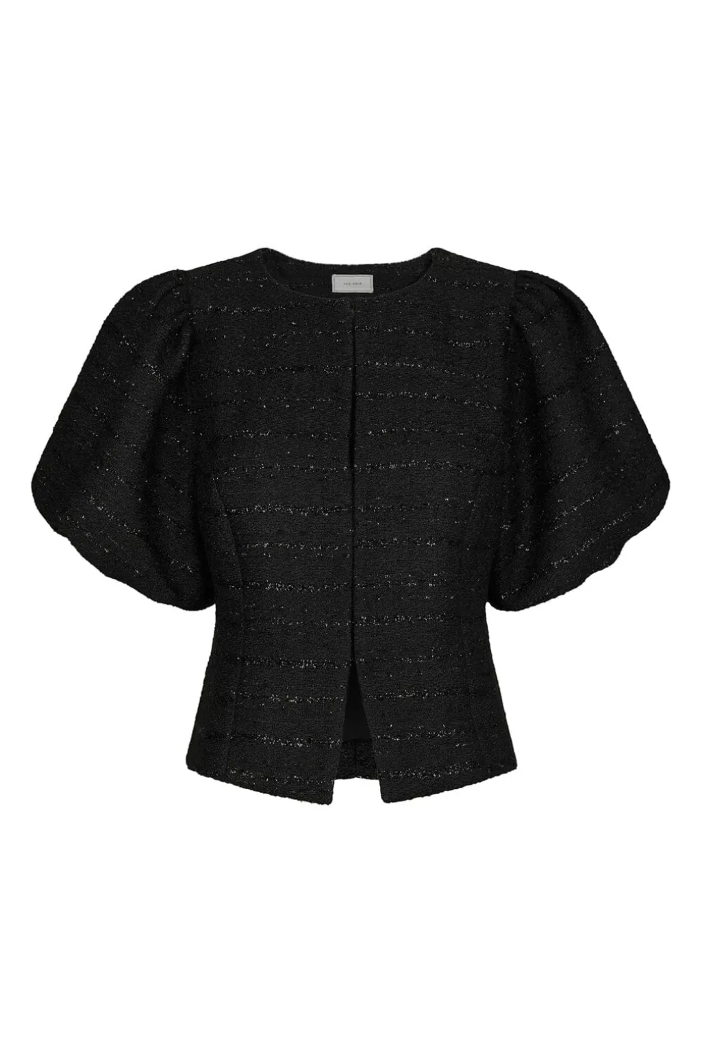 Sort bluse fra Neo Noir i boucle-stof med glimmereffekt i de vandrette striber. Blusen har pufærmer og knaplukning foran samt en kropsnær pasform ved taljen.