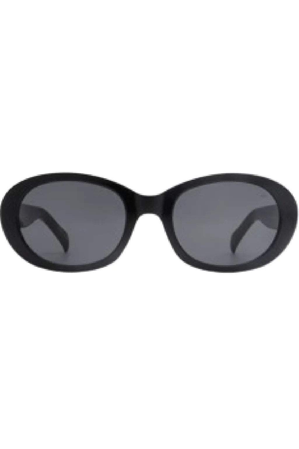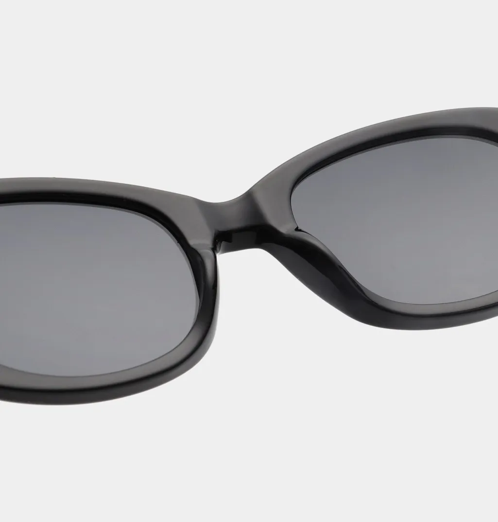 Sorte solbriller fra A. Kjærbede med oval ramme og kraftige sider. Stellet har en afrundet form med mørke glas og tyk kant, der giver god beskyttelse mod sidelys.