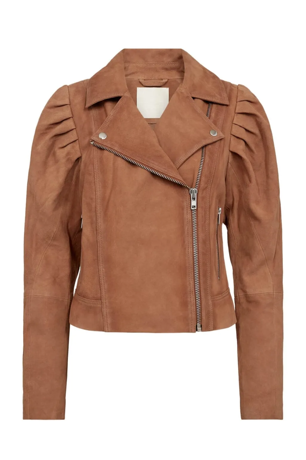Brun ruskindjakke fra Gossia med asymmetrisk lynlås og skjortekrave. Jakken har dekorative syninger på skuldrene og flere lukkemuligheder.