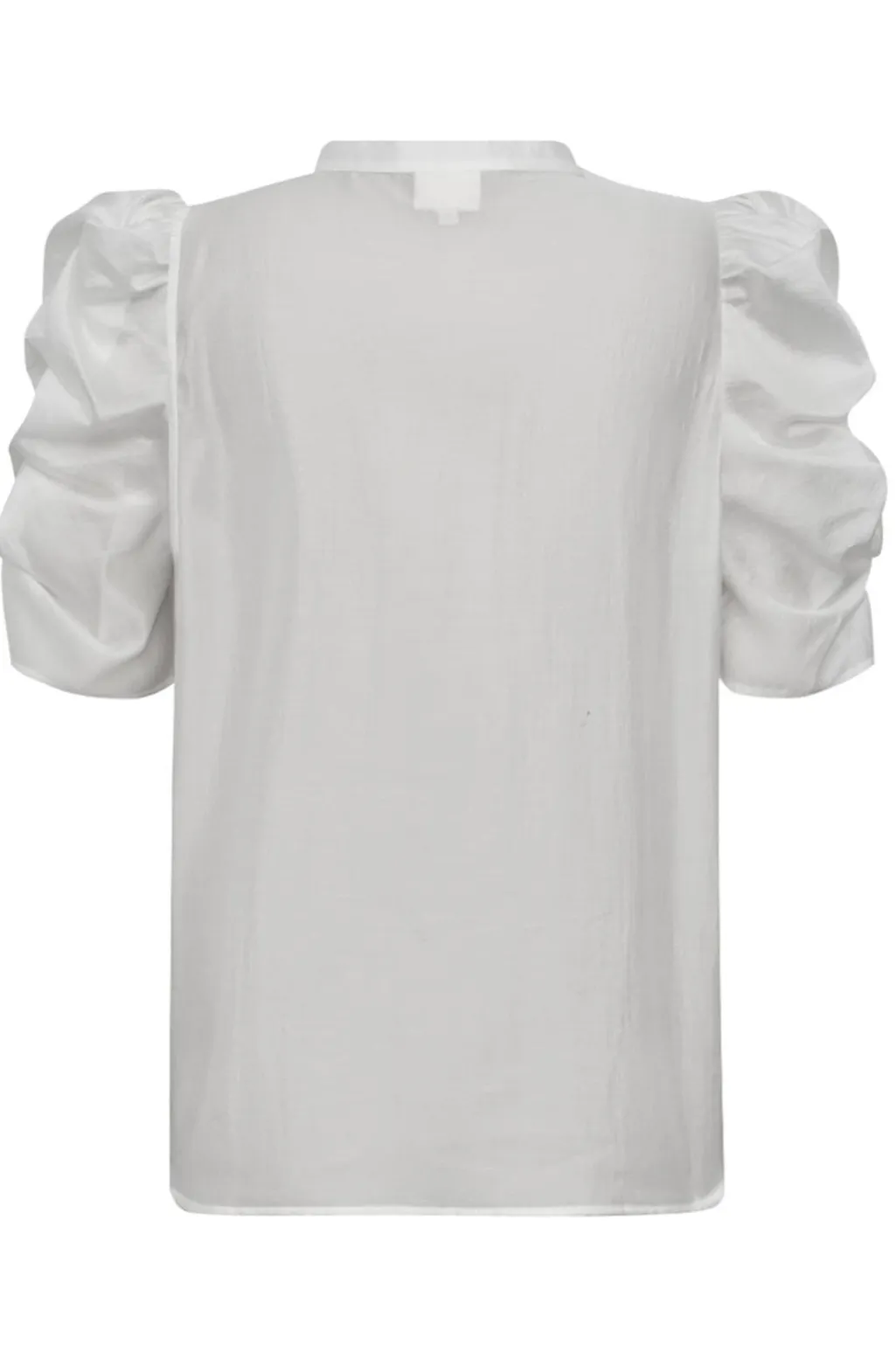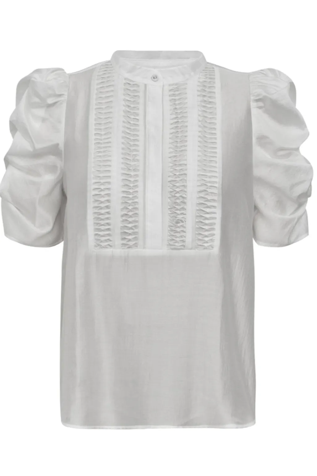 Off-white bluse fra Gossia med høj hals og korte, puffede ærmer. Blusen har lodrette flæser på forsiden og kan bruges til både formelle, afslappede og festlige lejligheder.