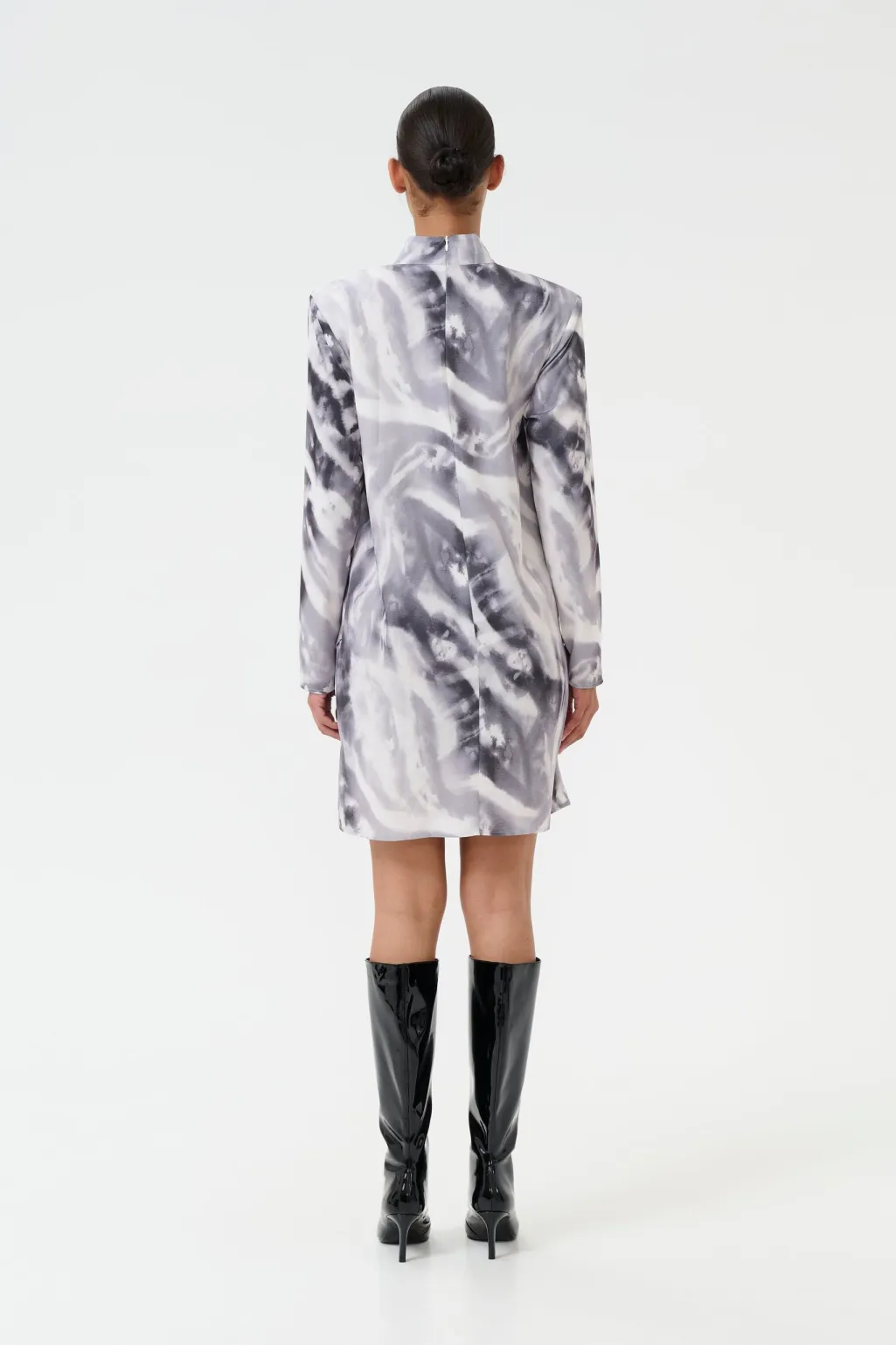 Kort kjole fra Gestuz med høj krave og lange ærmer. Kjolen har et sort og hvidt dyreprint med draperinger på den ene side og flæsedetaljer.