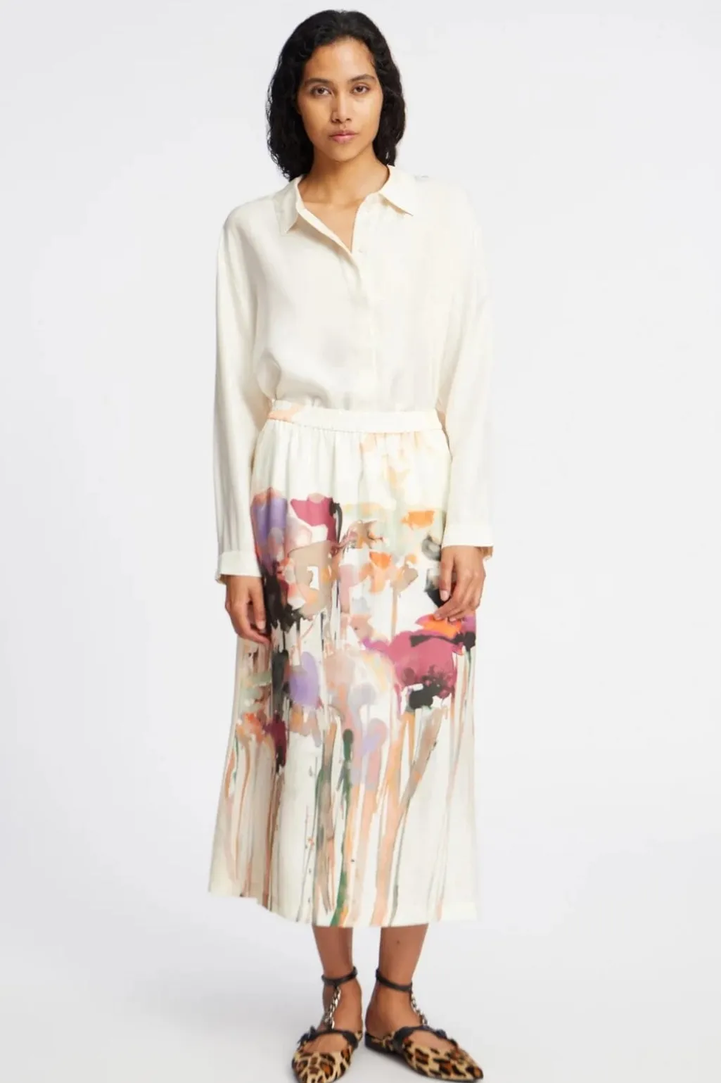 Sandfarvet nederdel fra Munthe med et kunstnerisk blomsterprint i pink, orange og lilla nuancer. Den har en elastisk talje og går til midt på læggen.
