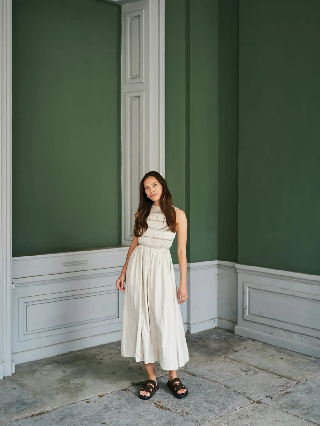 Ærmeløs kjole fra Neo Noir i cremehvid bomuld. Kjolen har smock-detaljer på overdelen og en høj halsudskæring. Nederdelen falder løst til midt på læggen.