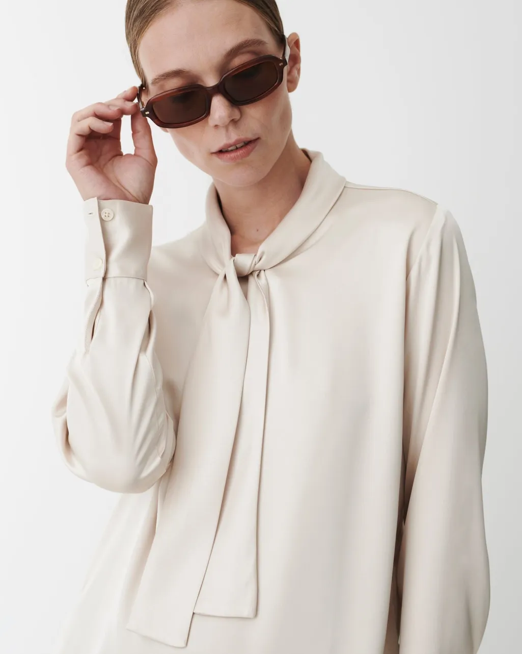 Cremefarvet bluse fra Karmamia med skinnende overflade og bindebånd ved halsen. Den blanke overflade kommer fra en blanding af triacetat og genanvendt polyester.